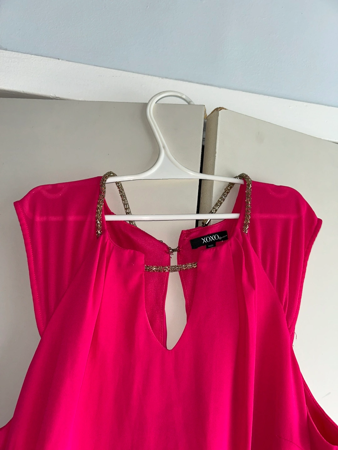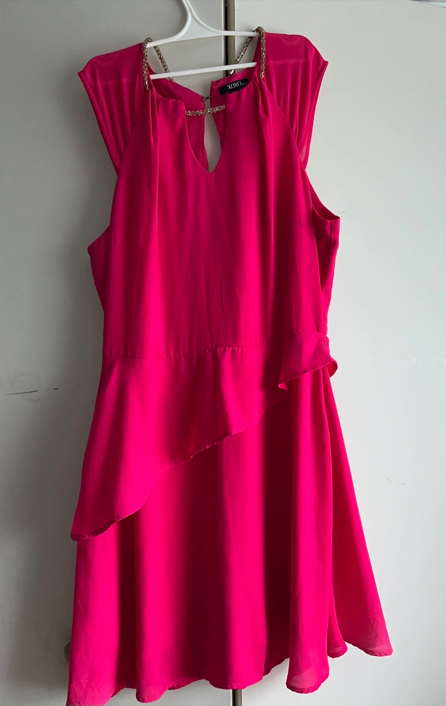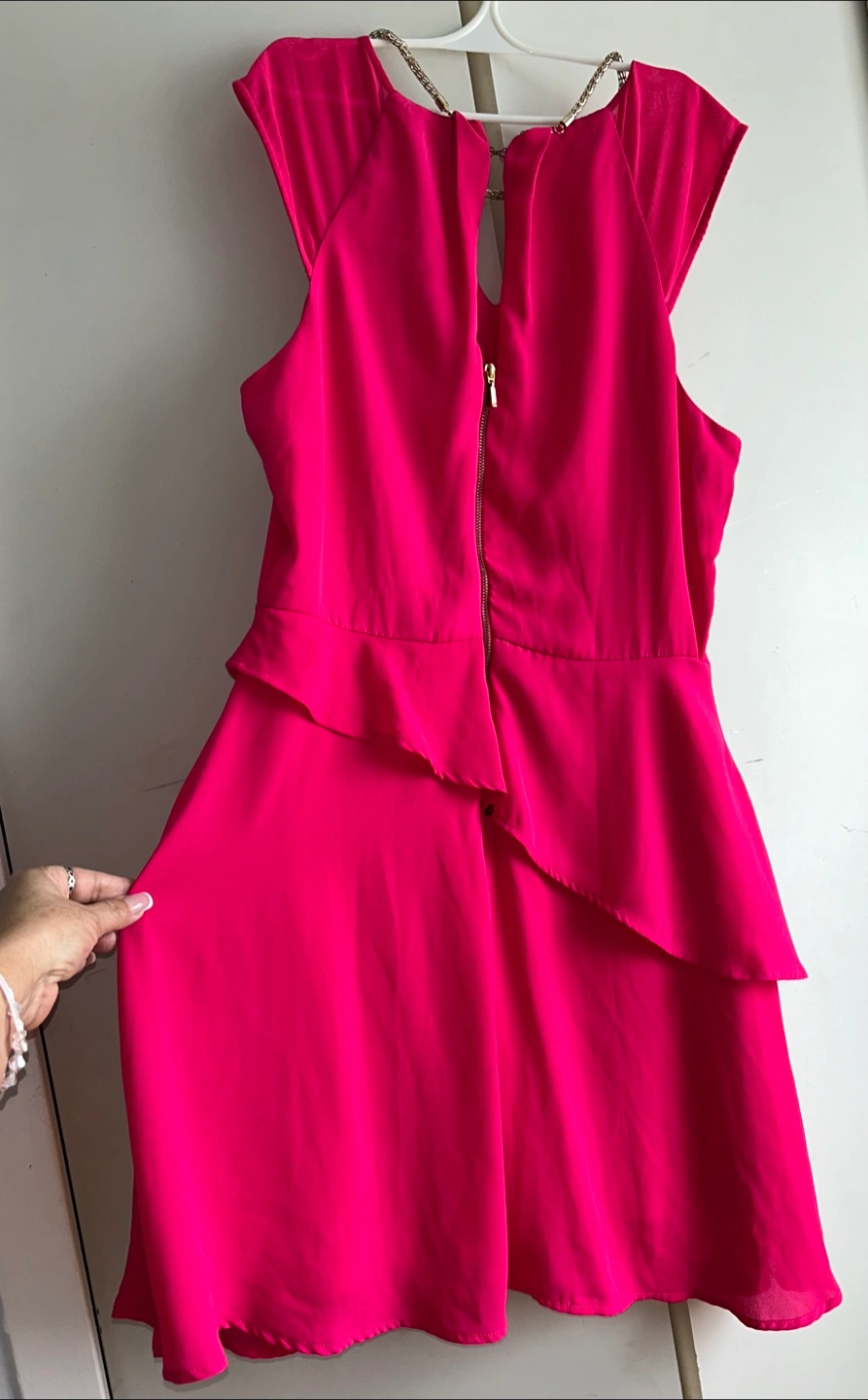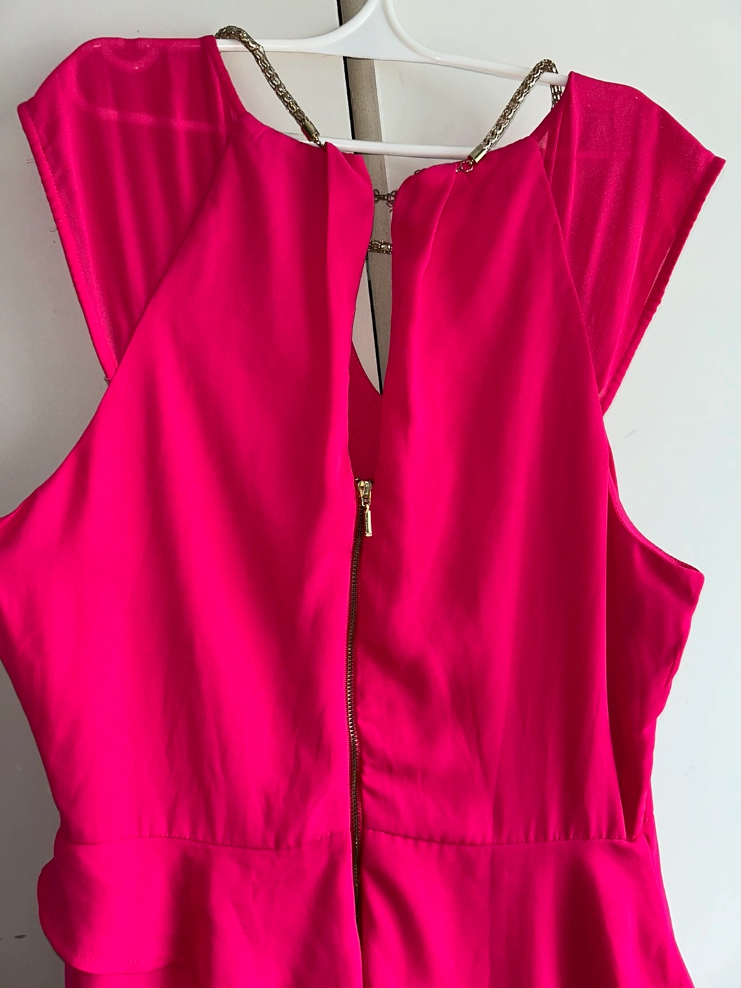A bright pink dress. Features chain details on the shoulders. The dress has a keyhole opening in the front. Ruffled details near the waist. Great for a night out with friends, or a romantic dinner.