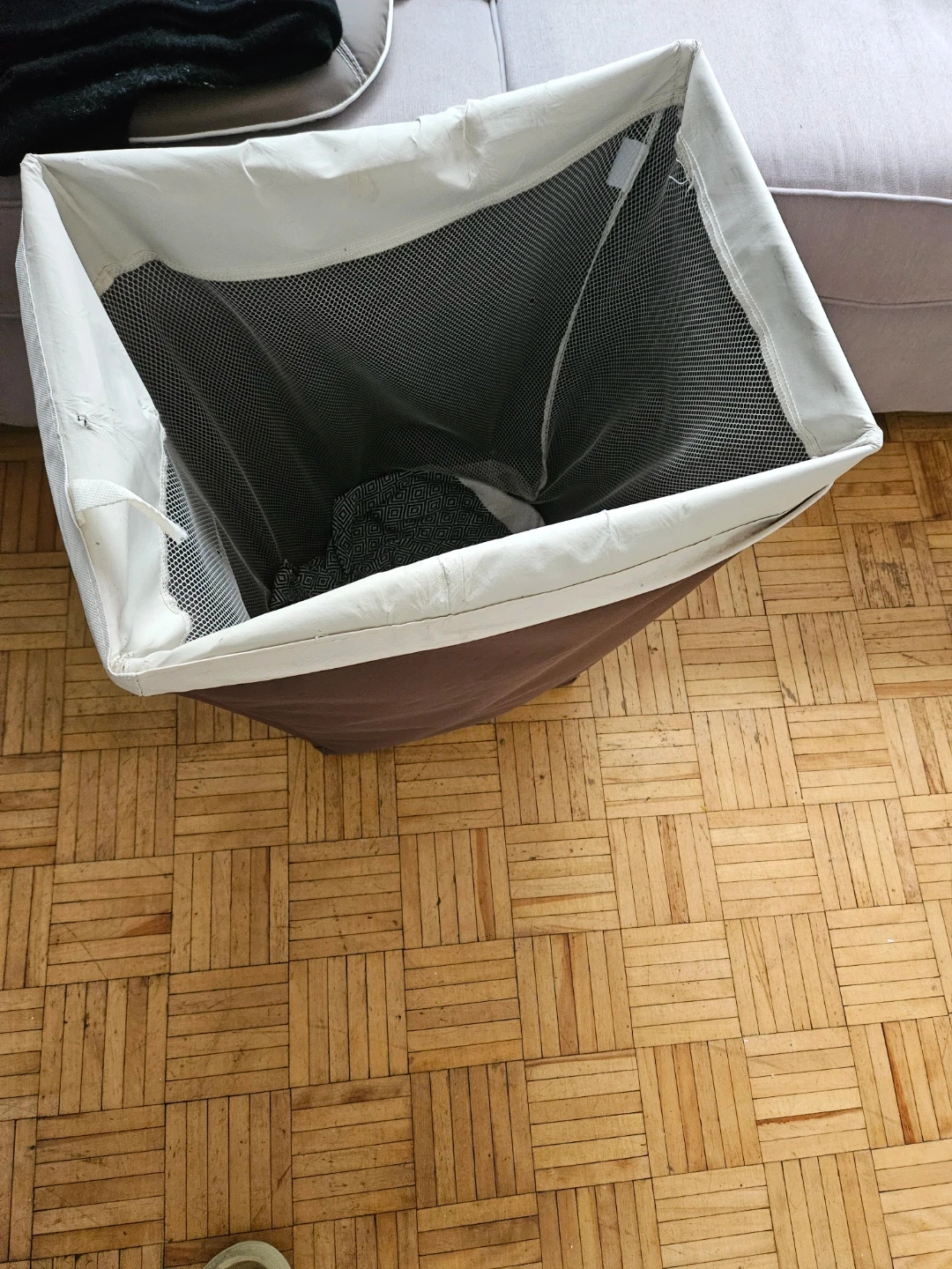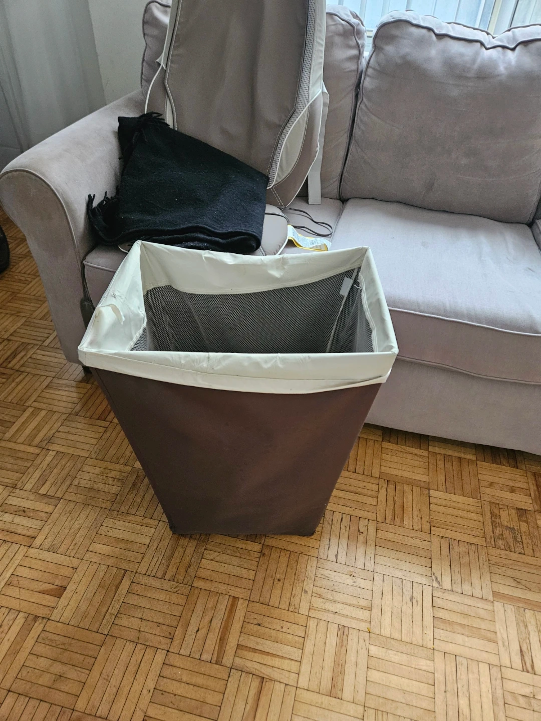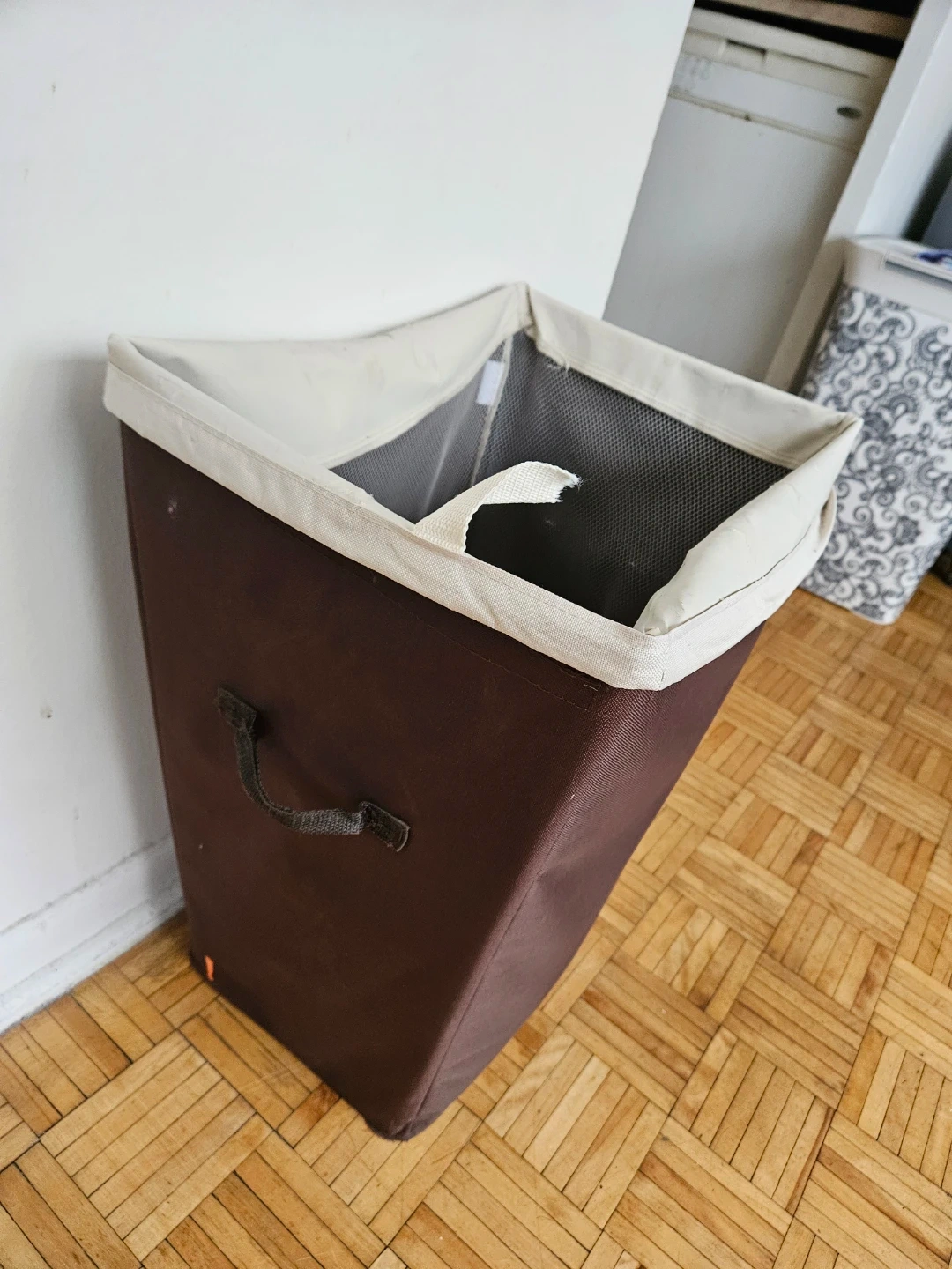 Selling a brown laundry hamper with a cream-coloured trim. It's in great shape and ready to use! The hamper has a convenient handle on the side for easy carrying. Perfect for keeping your laundry tidy and organized!
