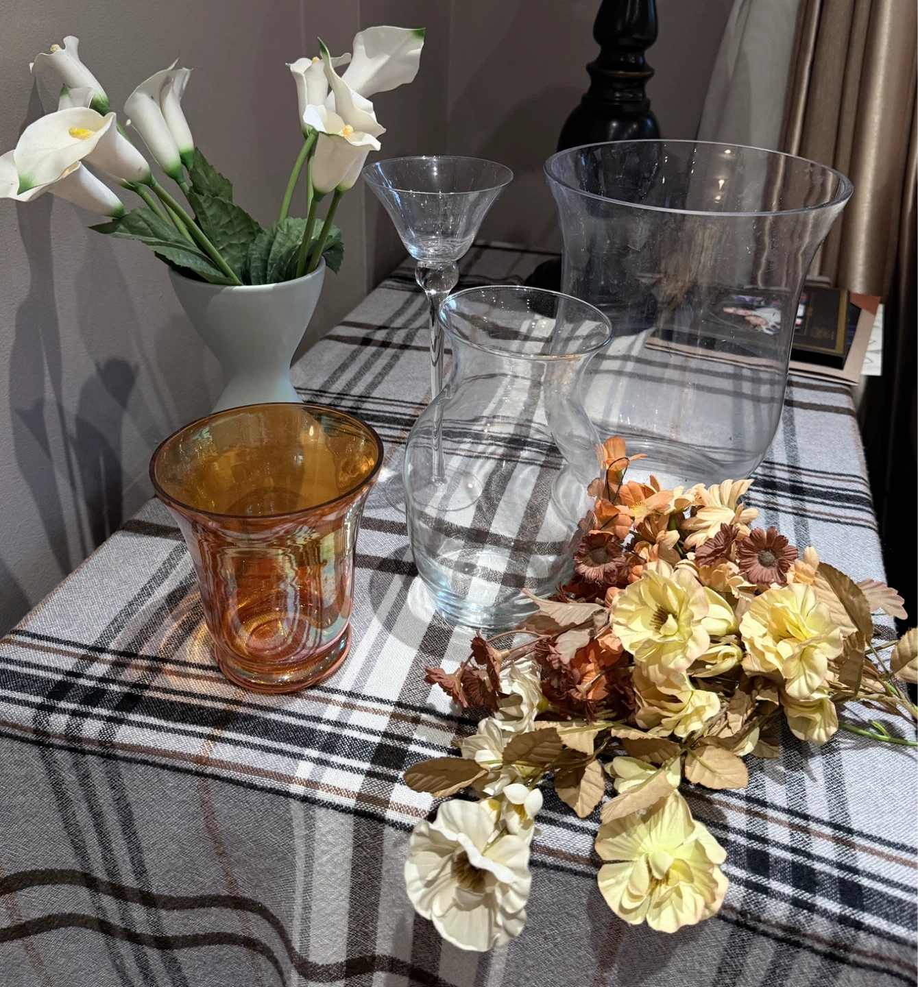 A collection of decorative glass vases and artificial floral arrangements. Includes clear glass vases and an amber iridescent vase, along with a bouquet of artificial flowers in cream and yellow hues.