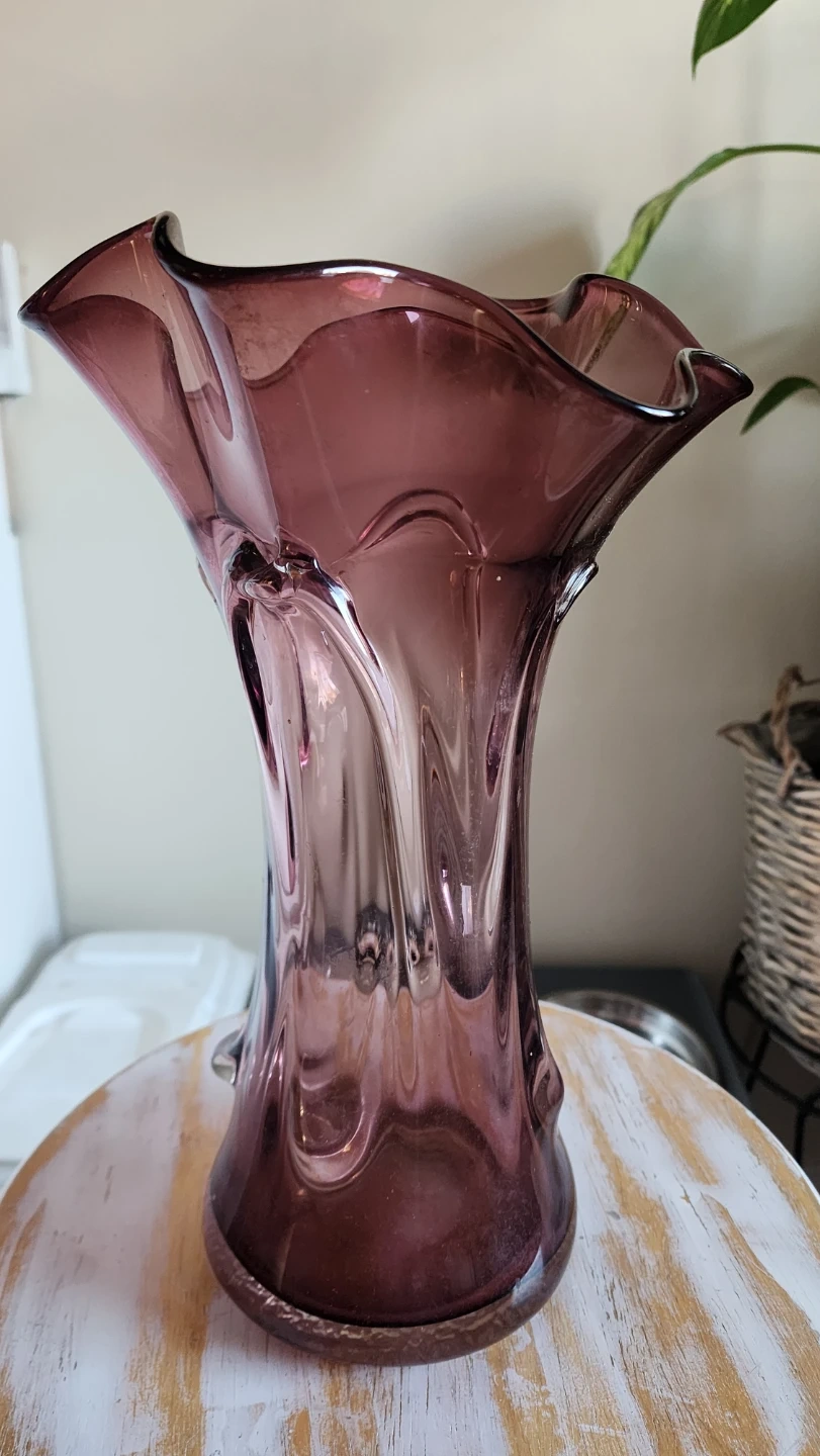 A beautiful purple glass vase, perfect for displaying your favourite flowers! It has a unique, elegant shape that would look great in any room of the house