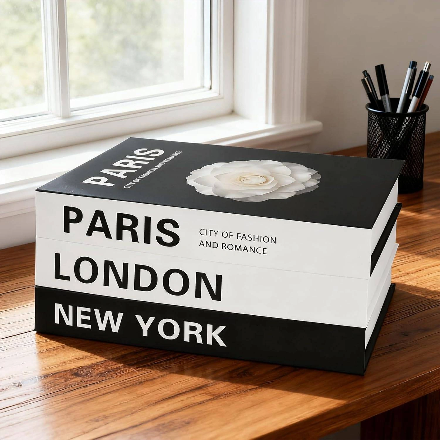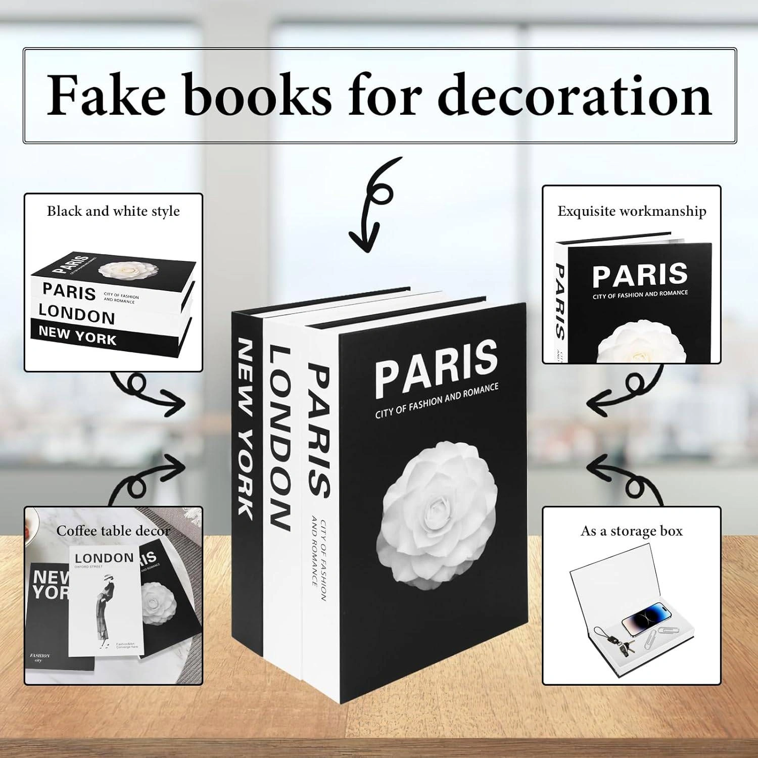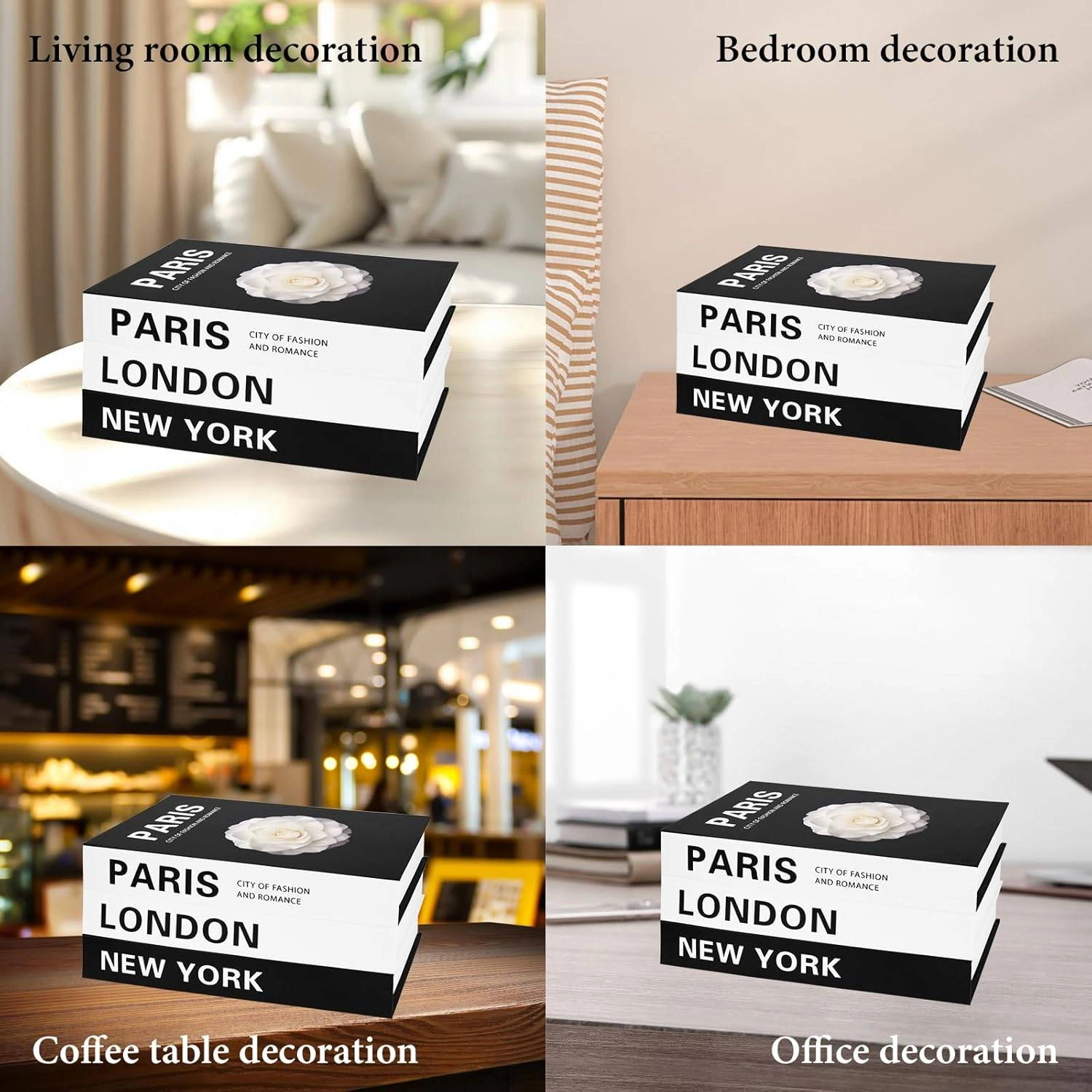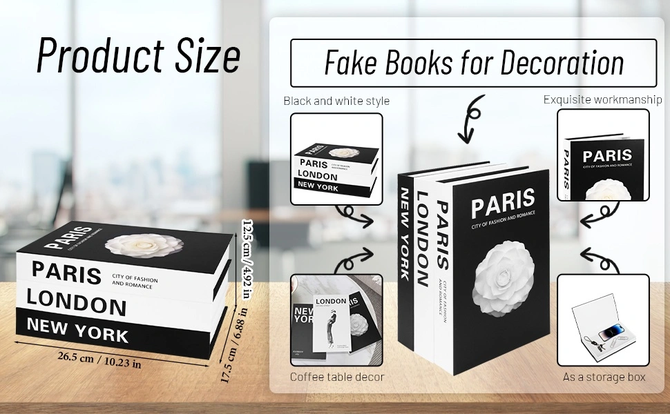 Add a touch of elegance to your home or office with this set of decorative books! The set includes three books with "Paris, London, New York" printed on the spines, perfect for adding a stylish touch to any coffee table, shelf, or desk. They can also be used as a storage box!