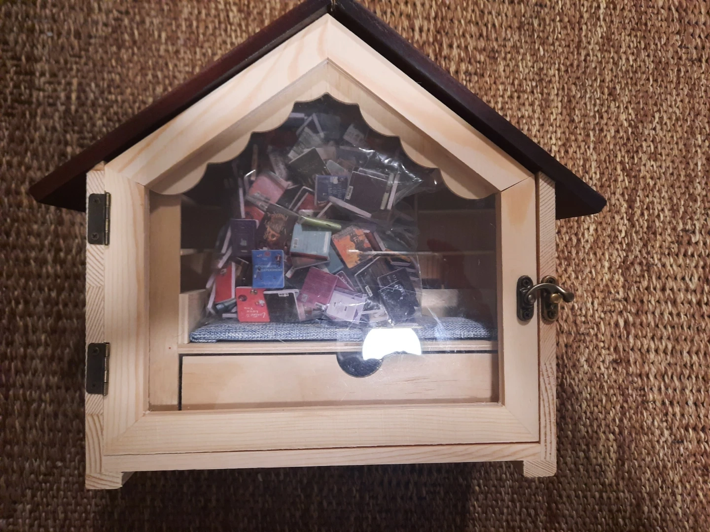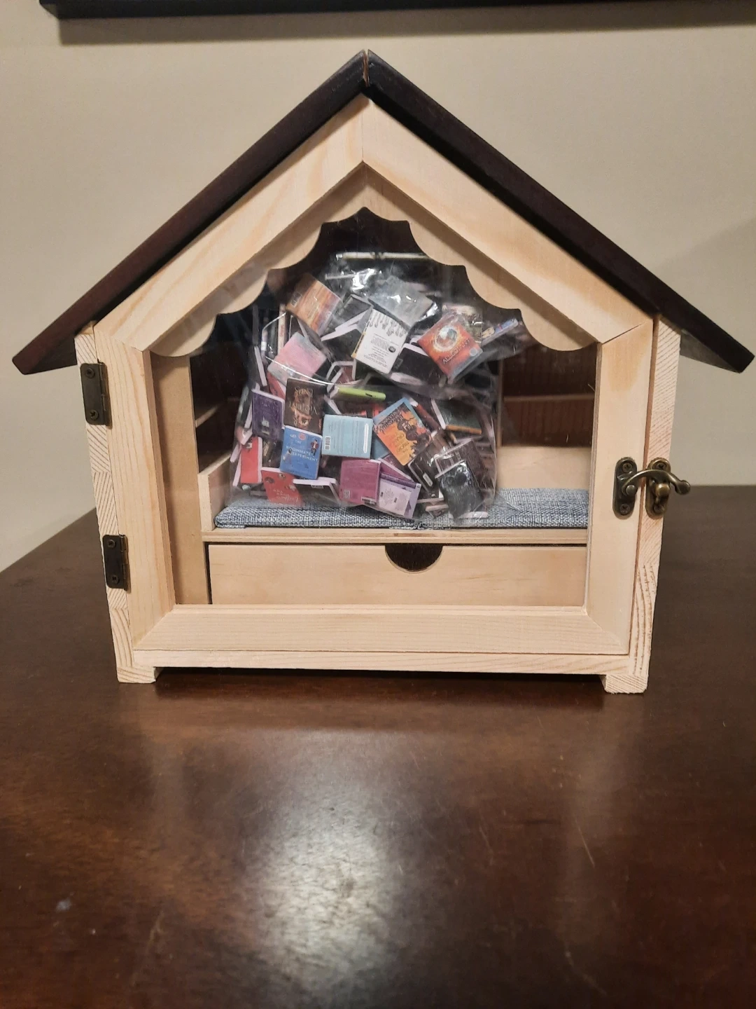 This charming wooden display case is designed to look like a miniature house. It features a clear front door and a small drawer at the bottom. Inside, it's filled with a collection of tiny, decorative books. It's a sweet decorative piece for a shelf or desk!
