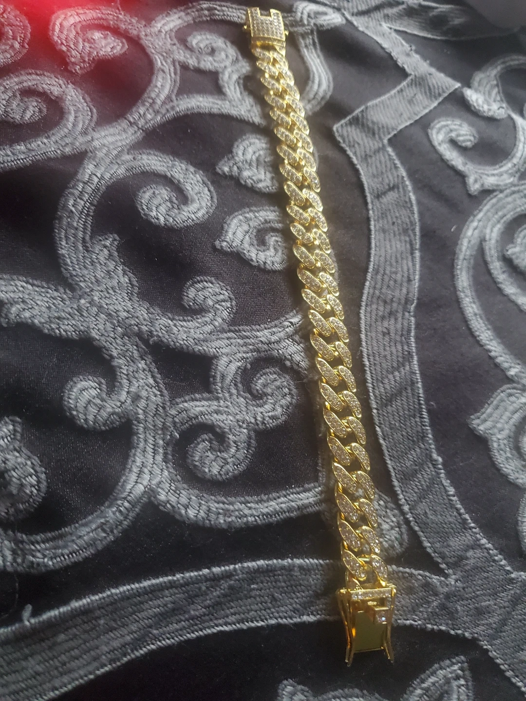 A stylish gold-toned Cuban link bracelet adorned with rhinestones. It features a secure clasp for easy wear. This bracelet adds a touch of sparkle to any outfit!