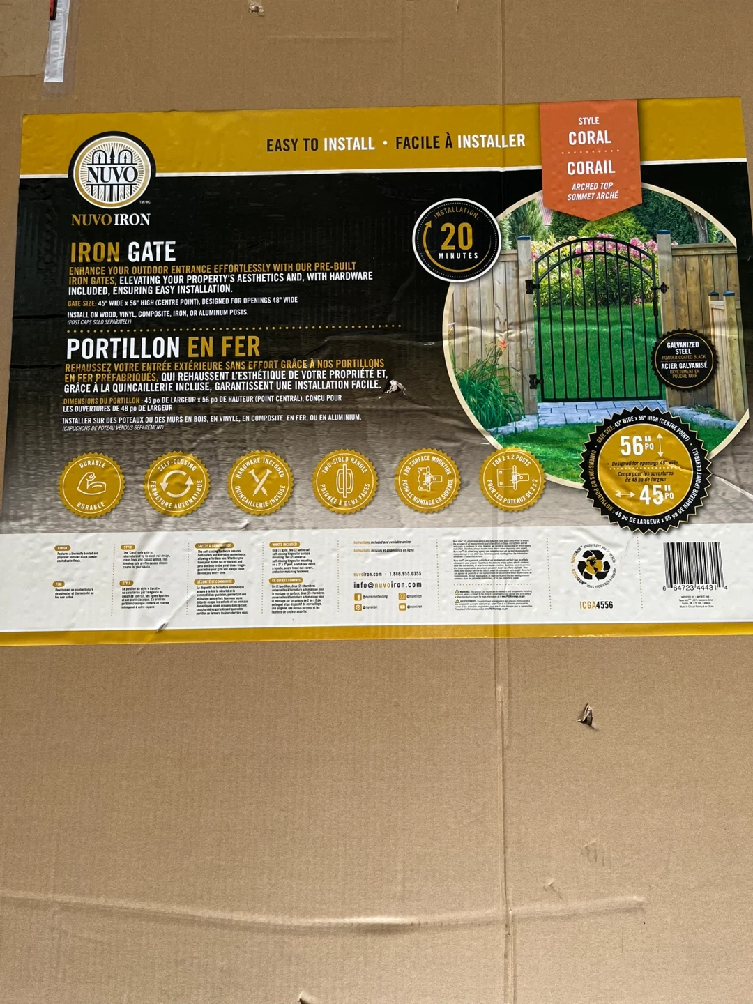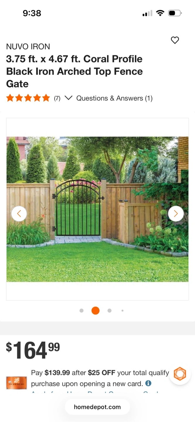This Nuvo Iron Coral Profile fence gate is made of black iron with an arched top. It's designed for openings 46" wide and includes hardware for installation. Galvanized steel construction. Brand new in box. Must pick up. You’ll need a SUV or bigger.