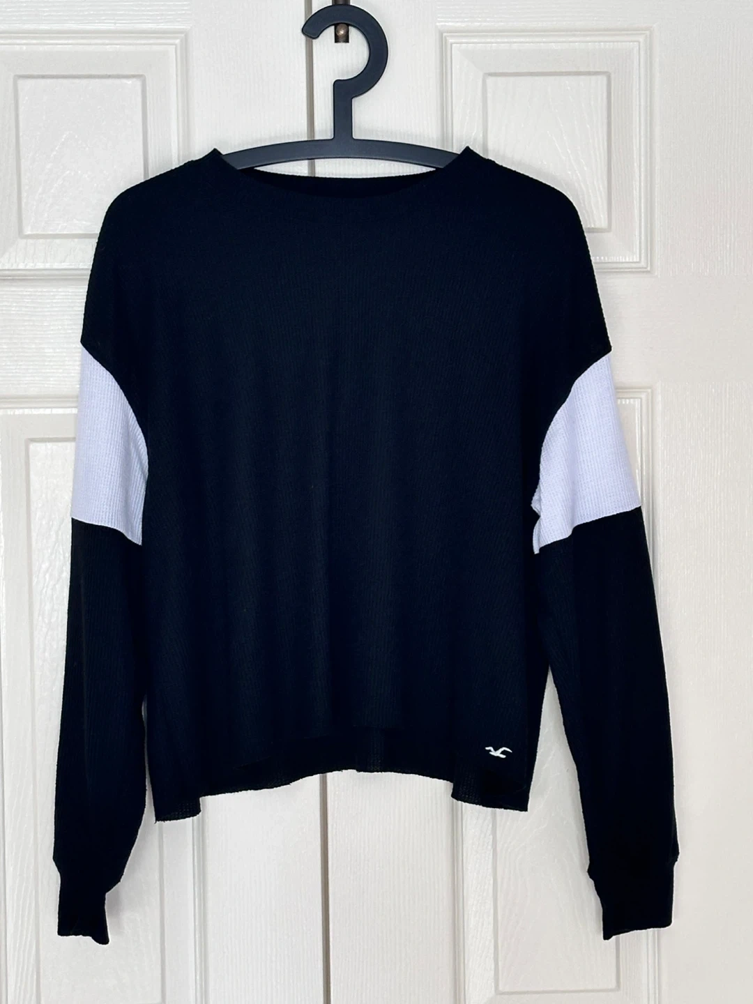 This is a Hollister sweater. It features a black body with white sleeves. It's a comfortable knit top.