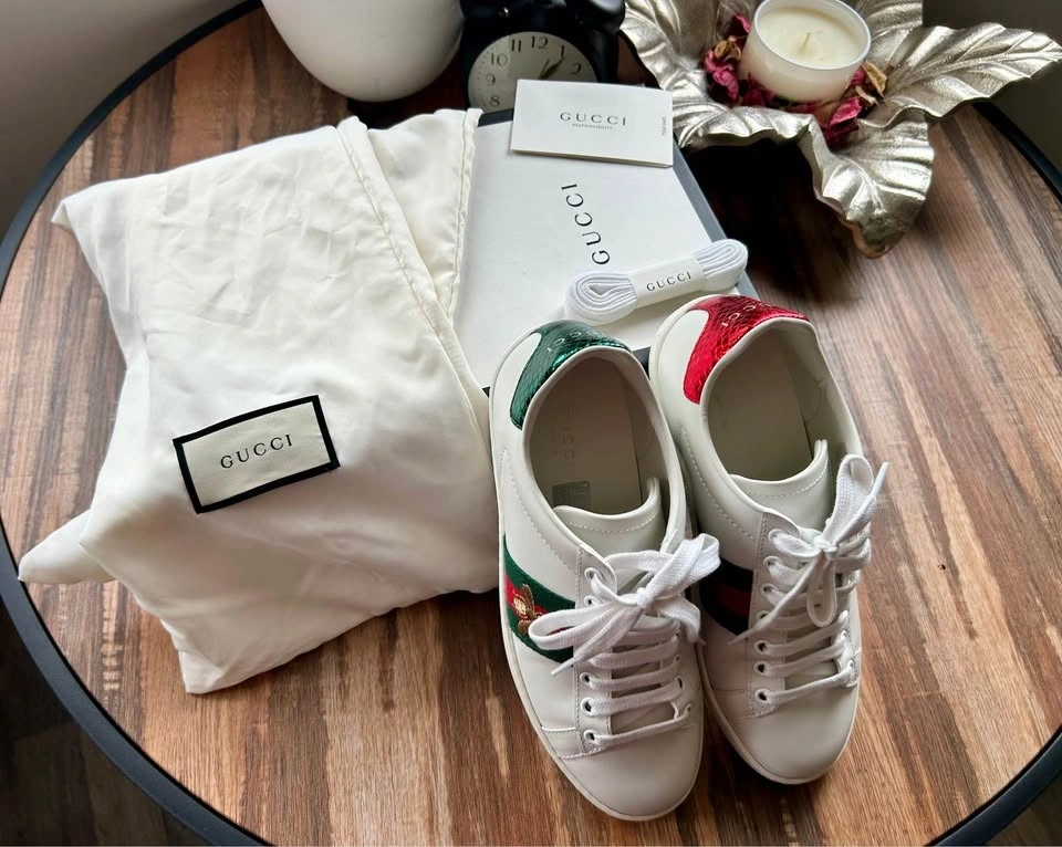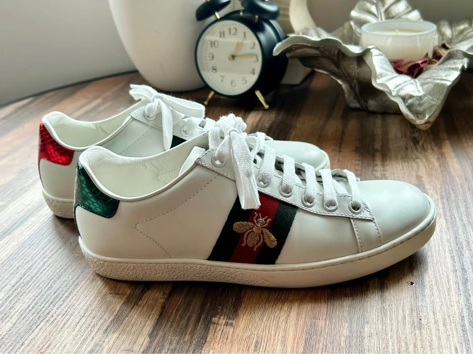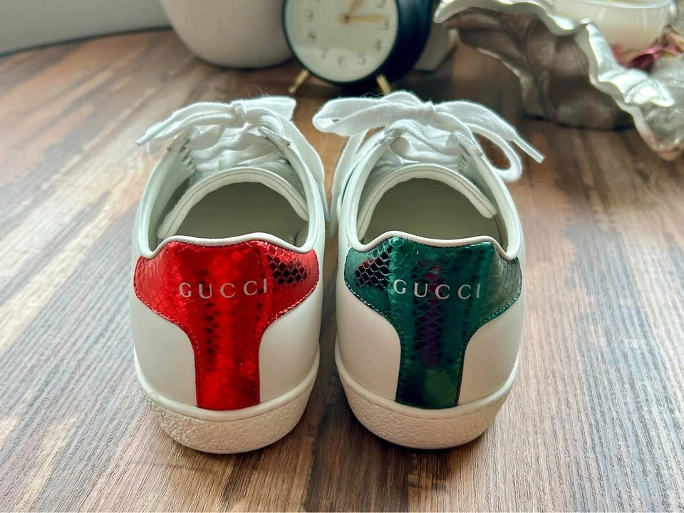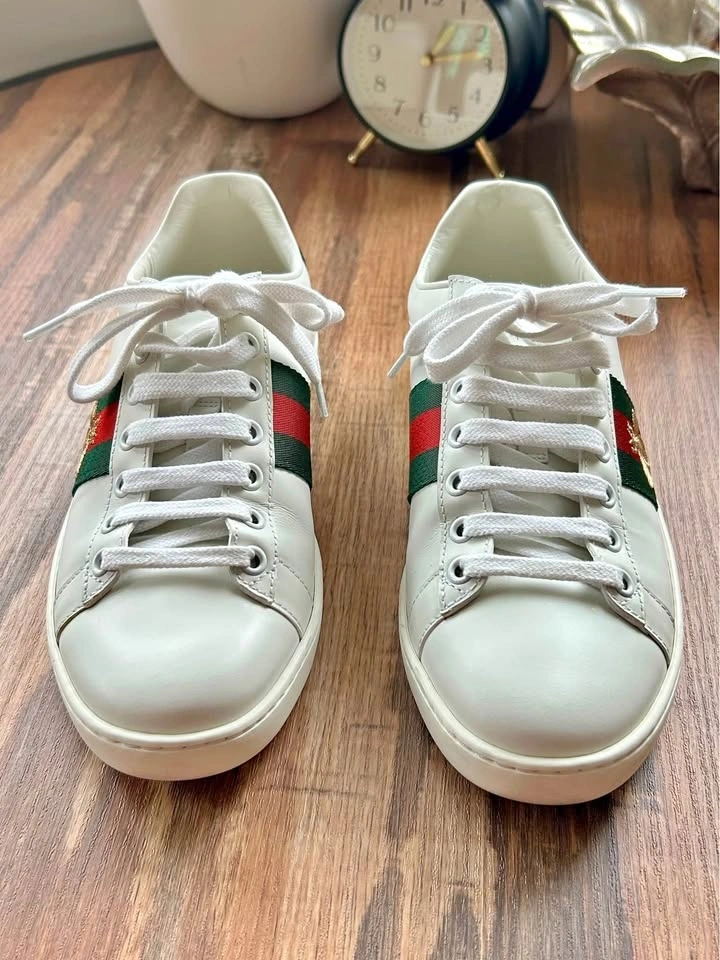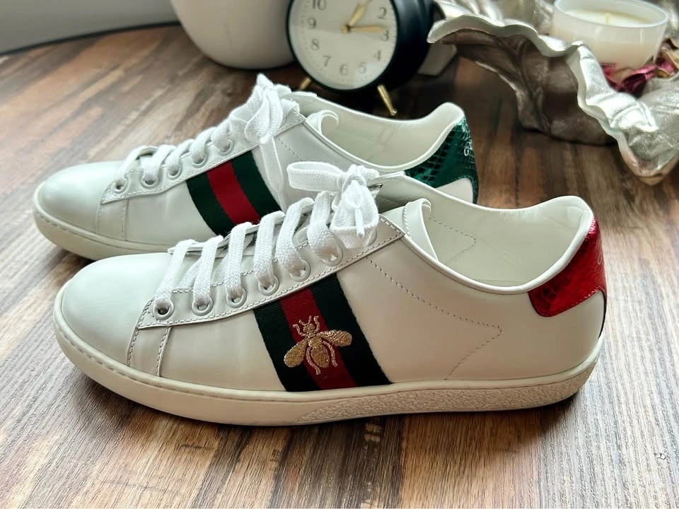 Stylish white Gucci sneakers with the iconic red and green stripe. One shoe features an embroidered gold bee detail. The back has red and green heel tabs with the Gucci logo. Super clean condition.