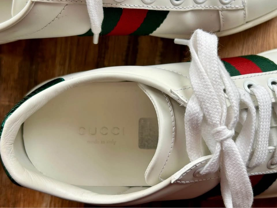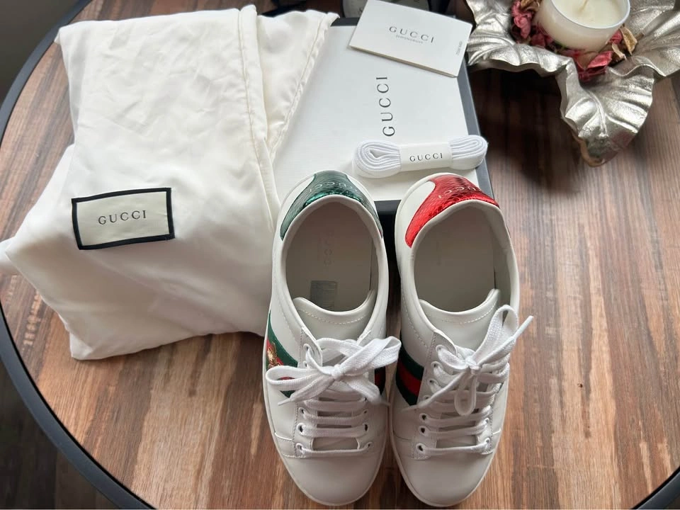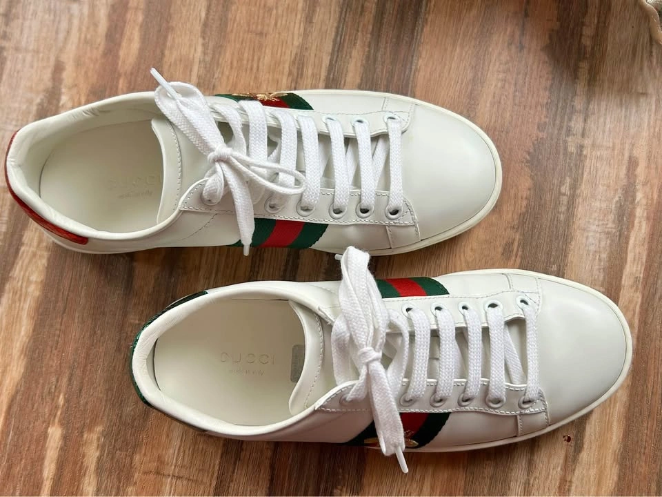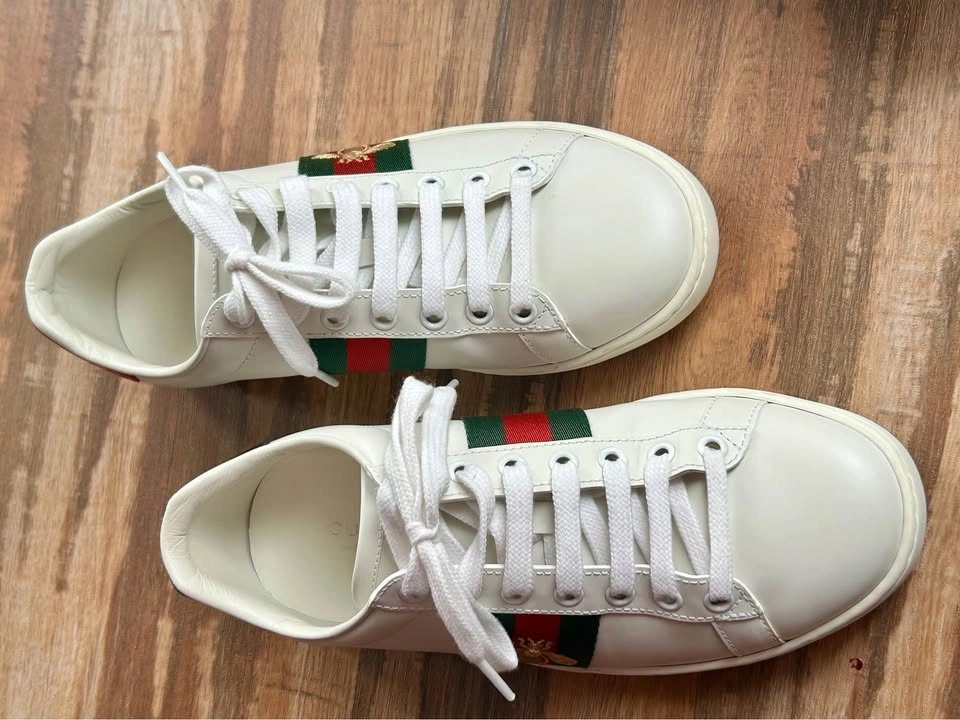 Stylish white Gucci sneakers with the iconic red and green stripe. One shoe features an embroidered gold bee detail. The back has red and green heel tabs with the Gucci logo. Super clean condition.