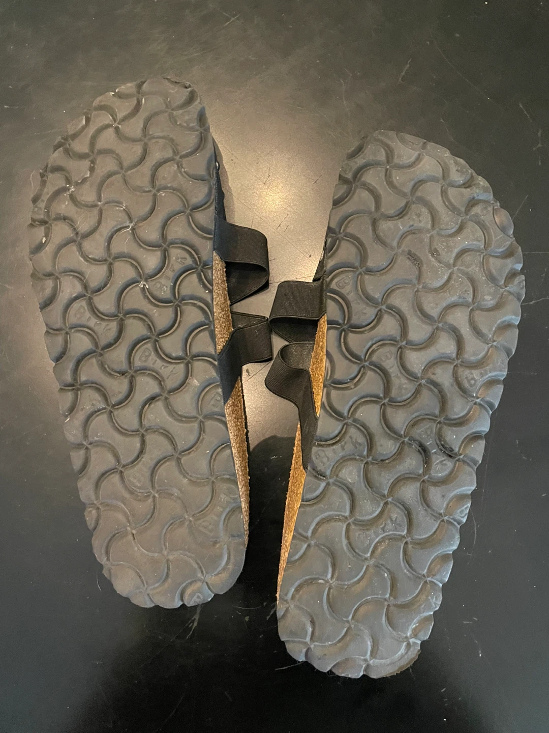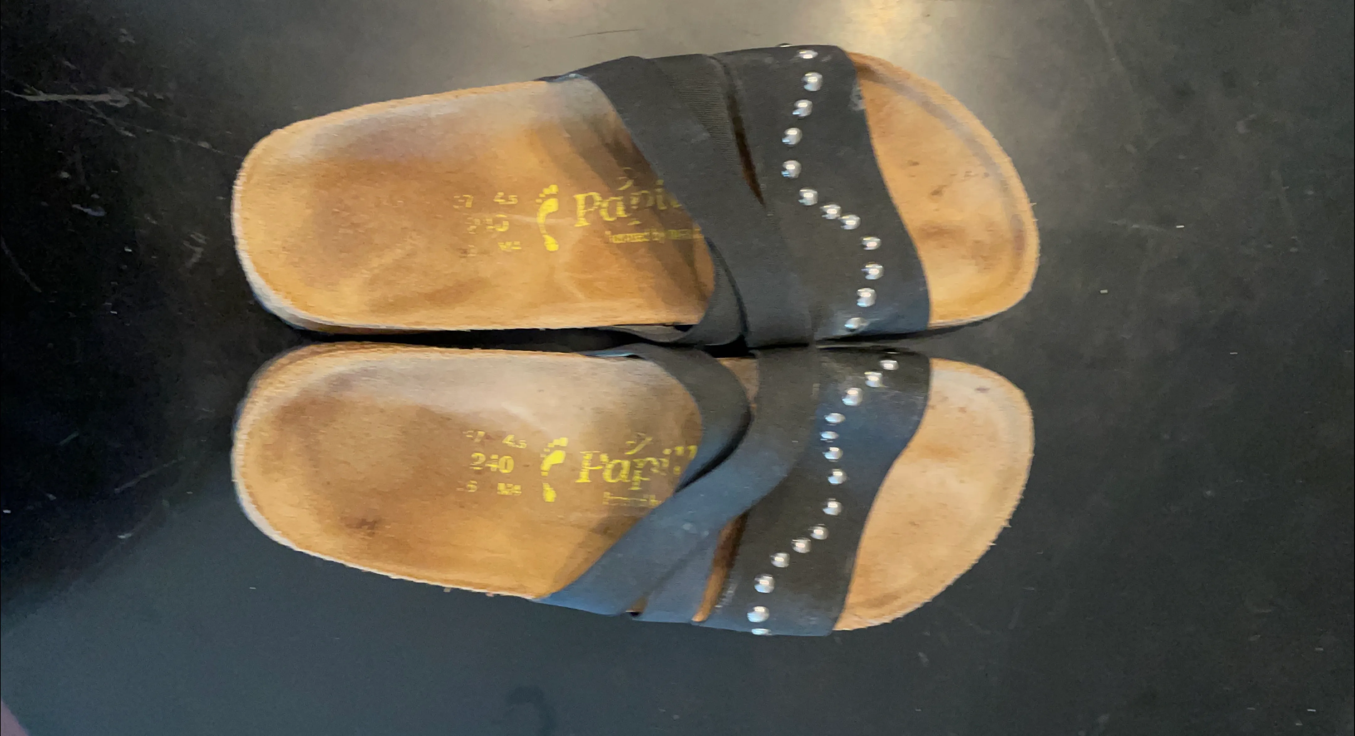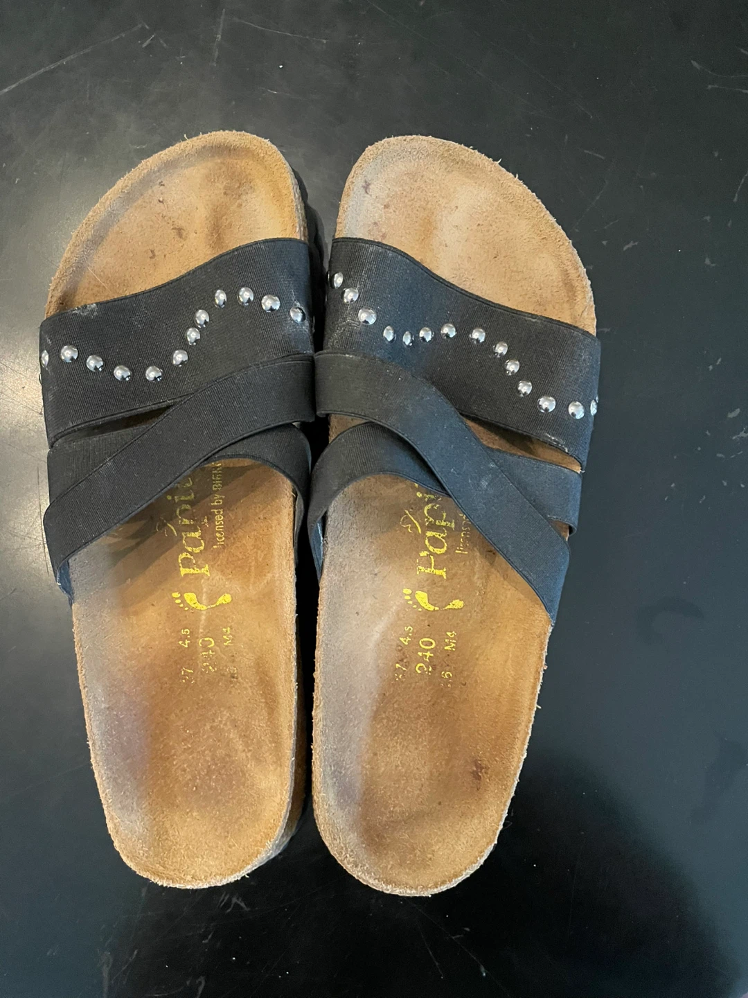 Selling a pair of Papillio by Birkenstock slides in size 37. They feature a stylish black strap with silver stud detailing. The footbed shows some wear, but they're still super comfy for everyday wear!