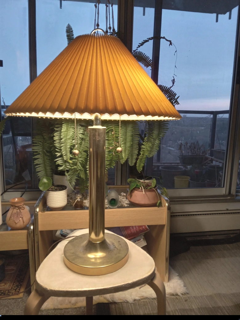 Beautiful vintage table lamp. Brass base and a pleated, gold-toned shade. Pull chains for easy on/off. Great addition to any home decor.