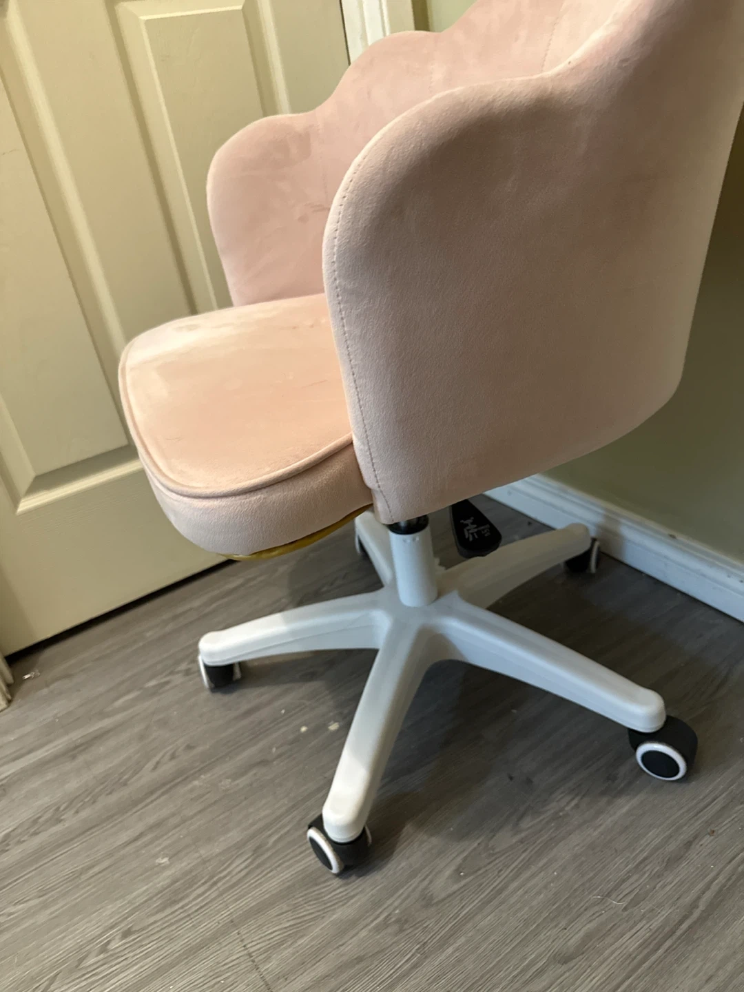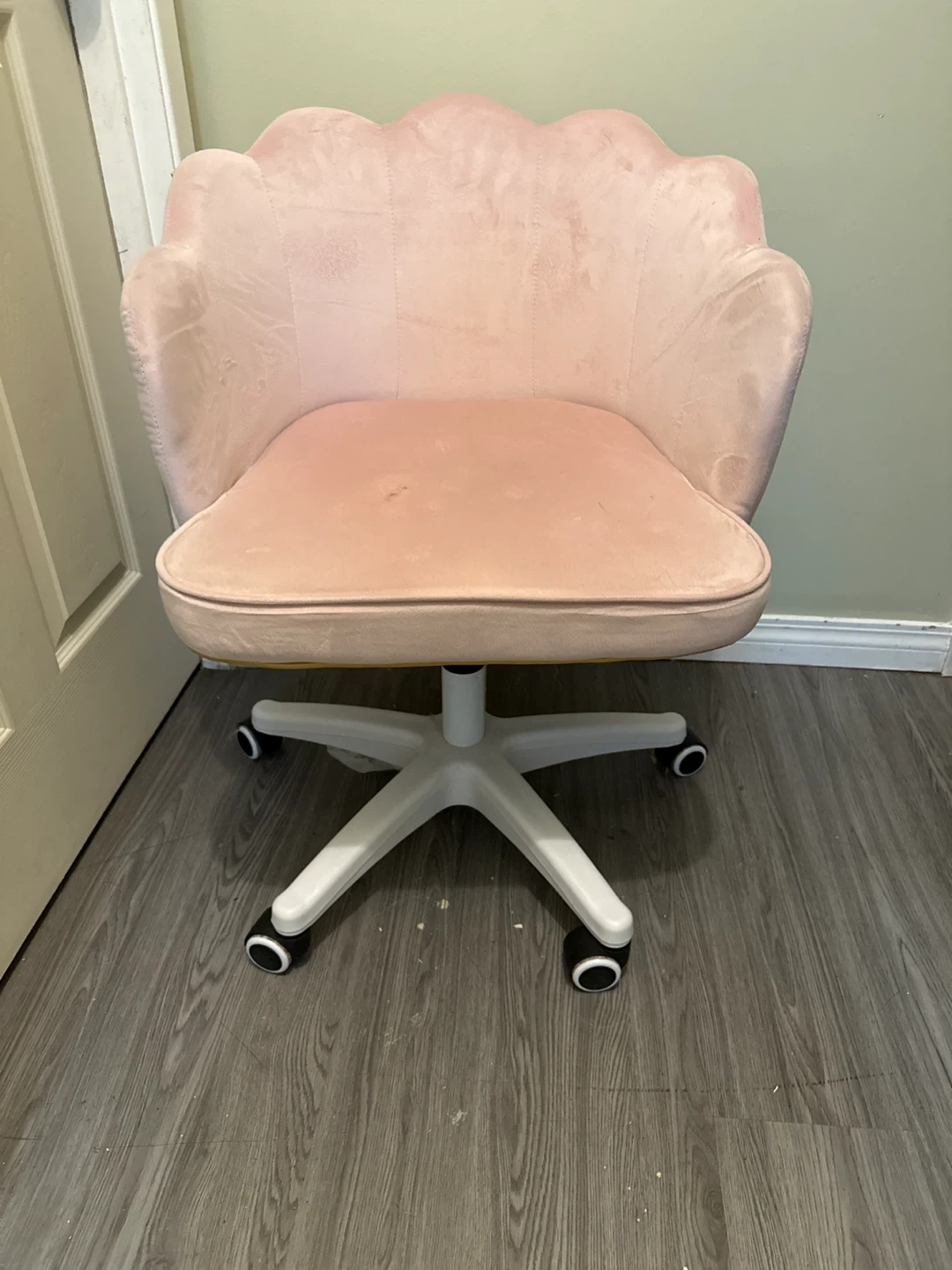This stylish pink velvet chair features a unique shell-shaped back and a comfortable padded seat. It's equipped with a smooth swivel base and caster wheels for easy mobility. The upholstery is soft to the touch, and the chair's design adds a decorative flair to any room. It's great for adding a pop of colour and comfort to a bedroom or office space.