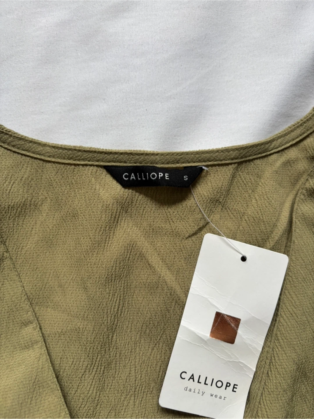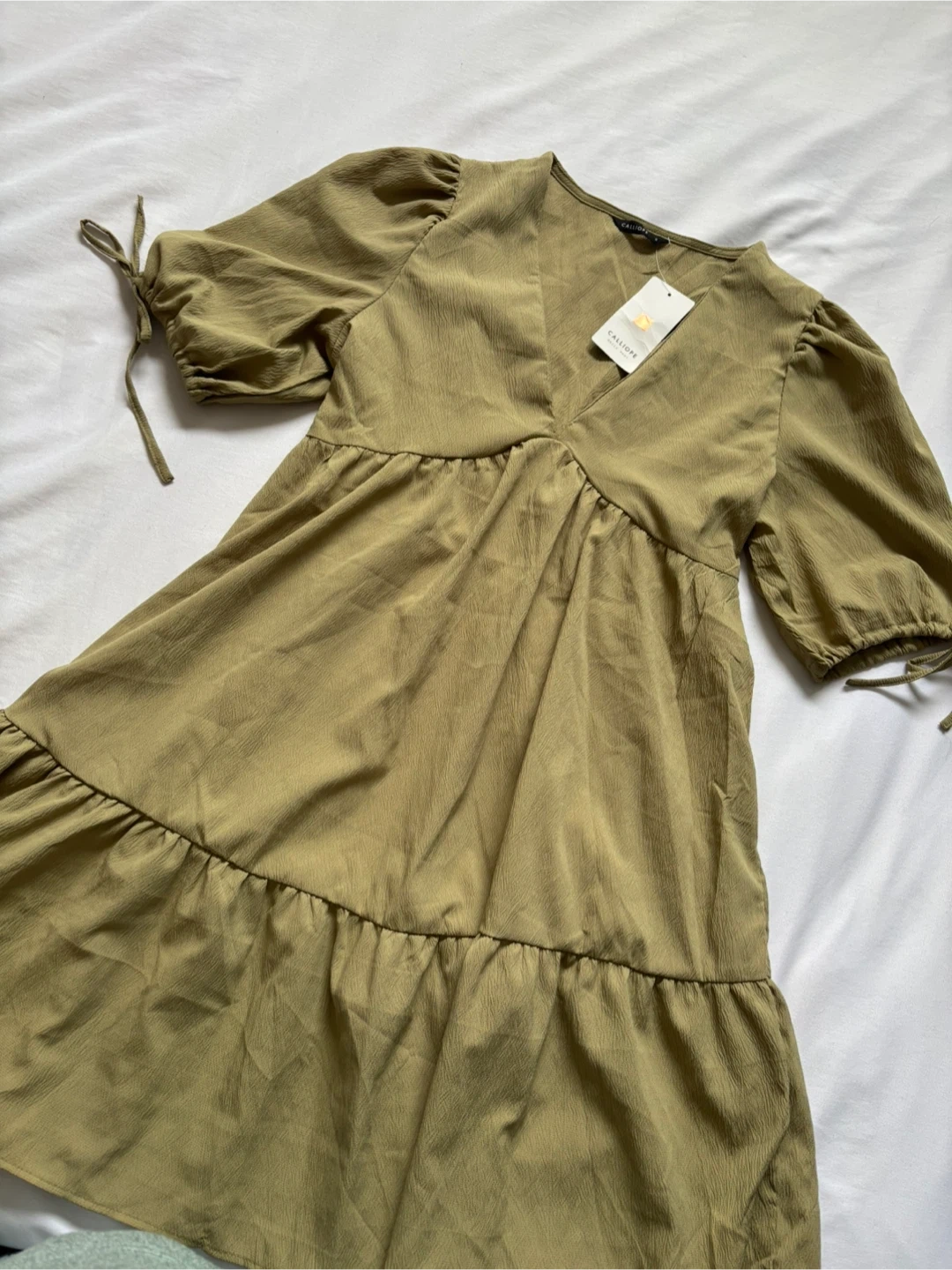 This is a Calliope women's olive green tiered mini dress. It's a size small with short puff sleeves. The fabric has a textured finish.