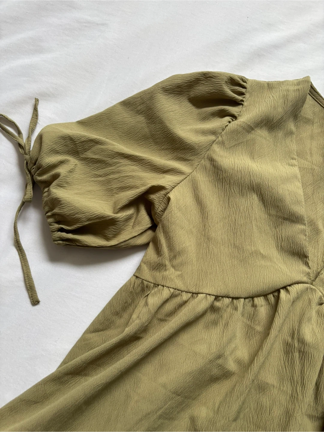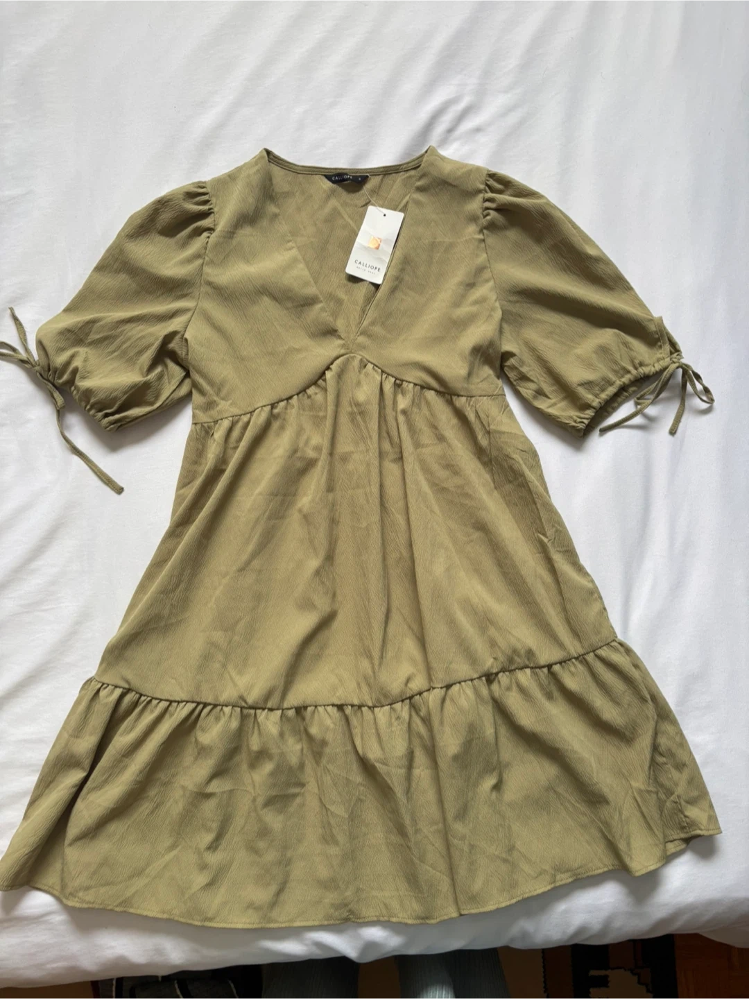 This is a Calliope women's olive green tiered mini dress. It's a size small with short puff sleeves. The fabric has a textured finish.