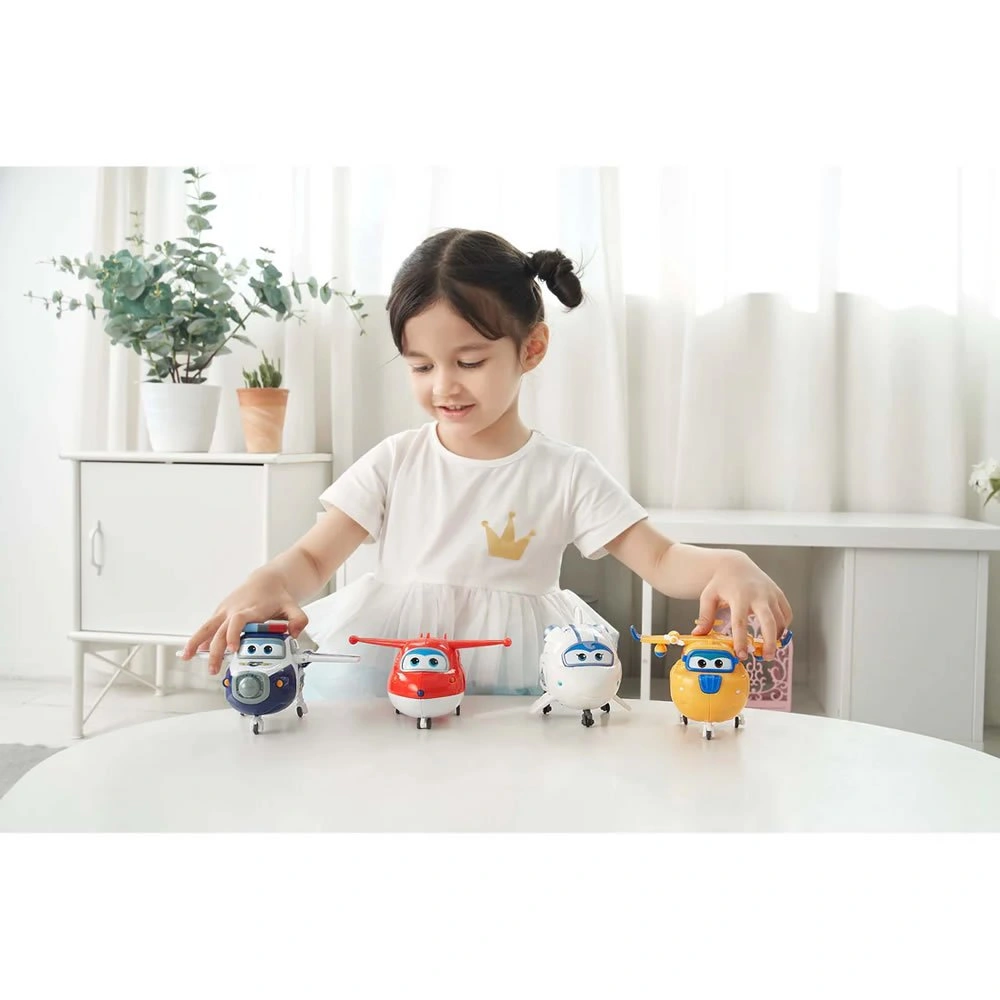The popular characters are perfectly matched together. The toy set features 4 fan-favorite characters in transform-a-bot: Jett, Paul, Astra and Donnie. The Super Wings team is always ready to transform and use teamwork on any mission to rescue, help and teach kids about the languages and cultures of the world. This toy is ideal for birthdays, parties, Children's Day, Christmas, Halloween, Thanksgiving and New Year's. This is a simple educational toy that allows children to operate independently and enjoy themselves with their parents and friends. Perfect gift for kids ages 3 years and up.