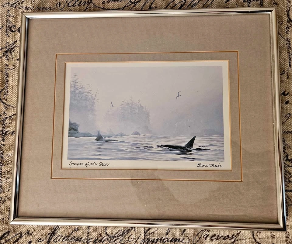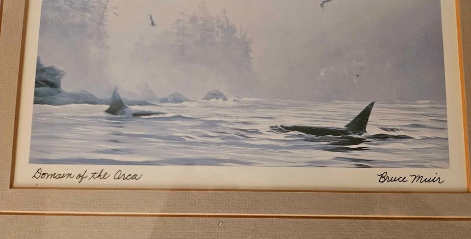 Beautiful framed art print by Bruce Muir. Features two orcas in an ocean scene with misty trees in the background. Titled 'Domain of the Orca'. Comes with a silver frame and neutral matting. Pick up near Guildford Mall.