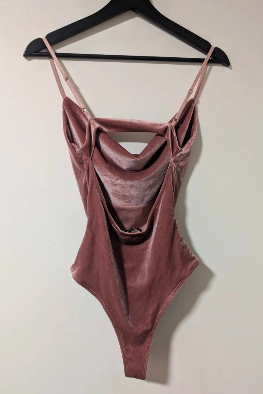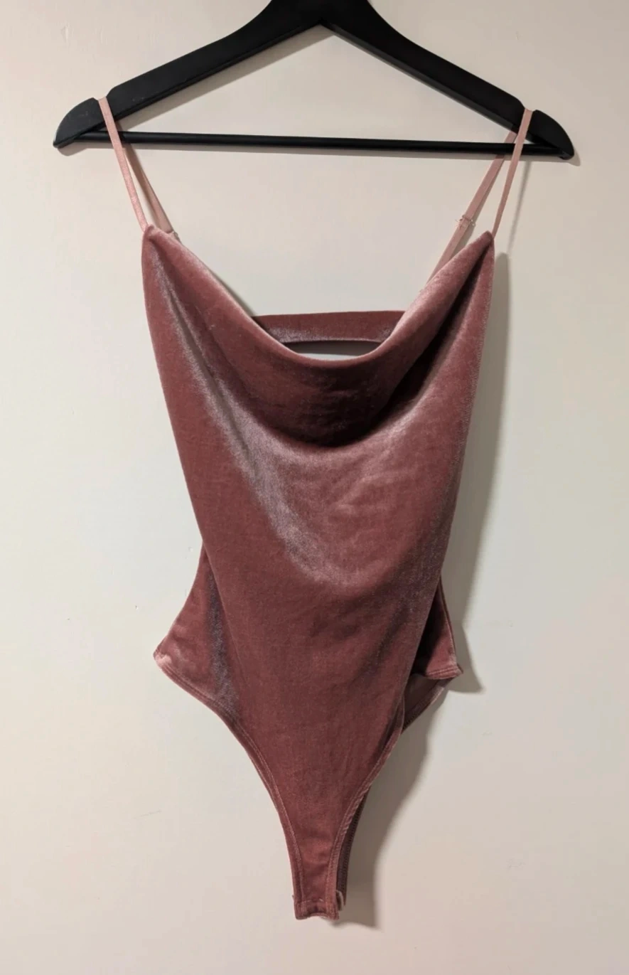 This is a Fashion Nova velvet bodysuit in a dusty rose colour. It's a size extra small. Made from a soft velvet material.