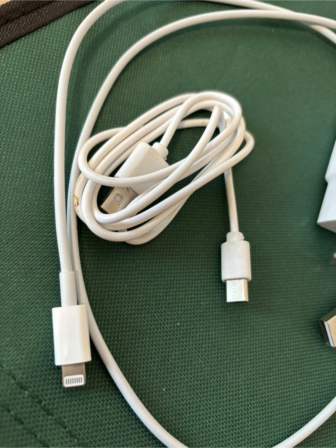 Samsung wall charger with Adaptive Fast Charging technology. Comes with a white USB-A to USB-C cable and a separate white USB-C to Lightning cable. It's great for quickly powering up your devices!