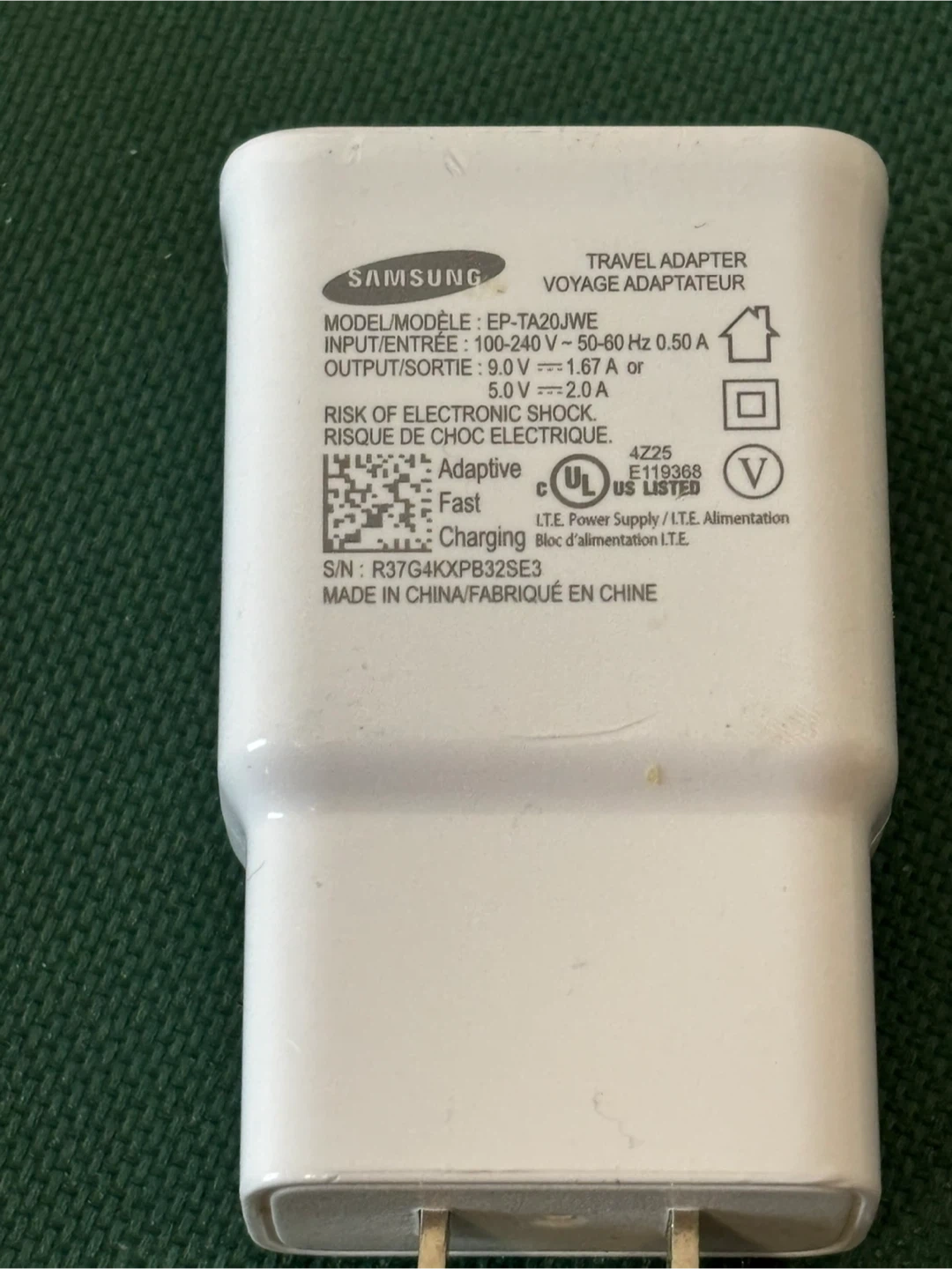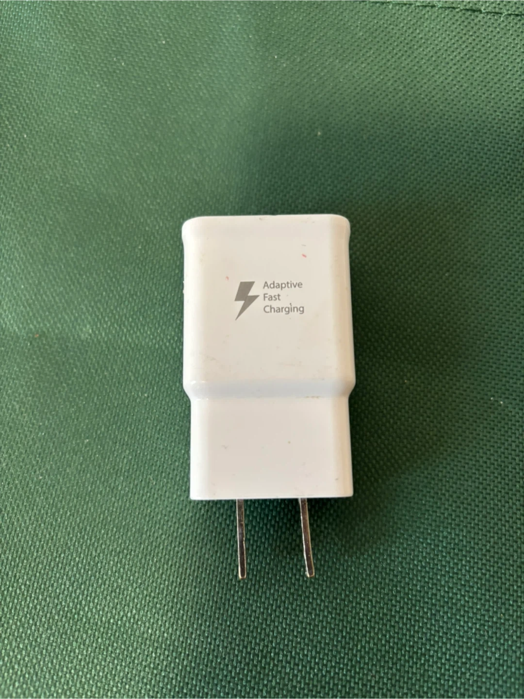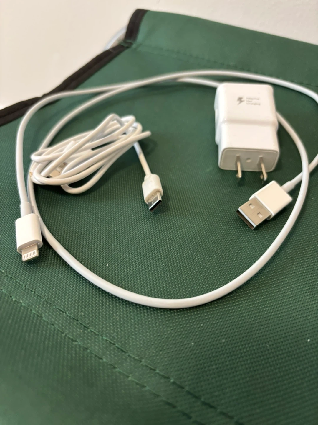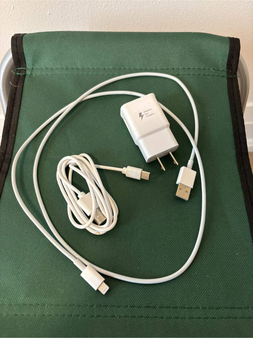 Samsung wall charger with Adaptive Fast Charging technology. Comes with a white USB-A to USB-C cable and a separate white USB-C to Lightning cable. It's great for quickly powering up your devices!