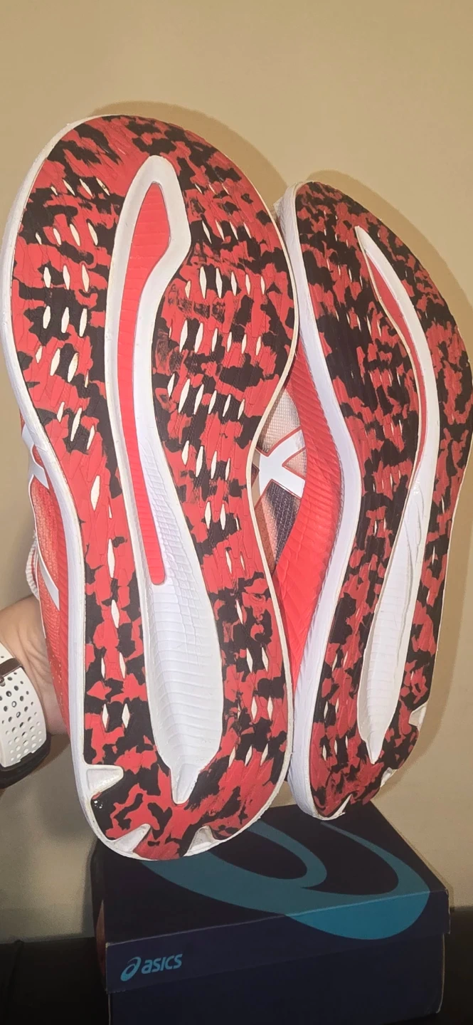 Selling a pair of Asics GlideRide running shoes in red, size 9.5. They come with the box.