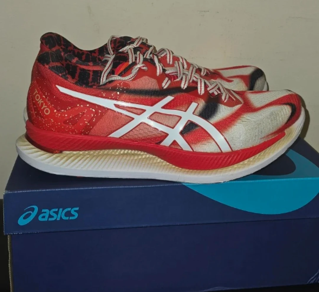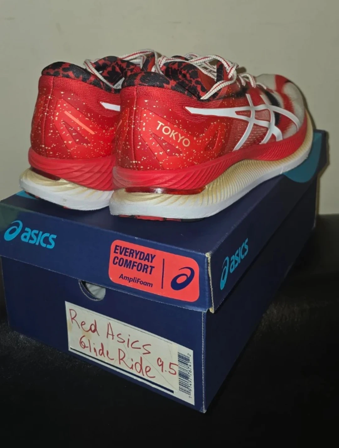 Selling a pair of Asics GlideRide running shoes in red, size 9.5. They come with the box.