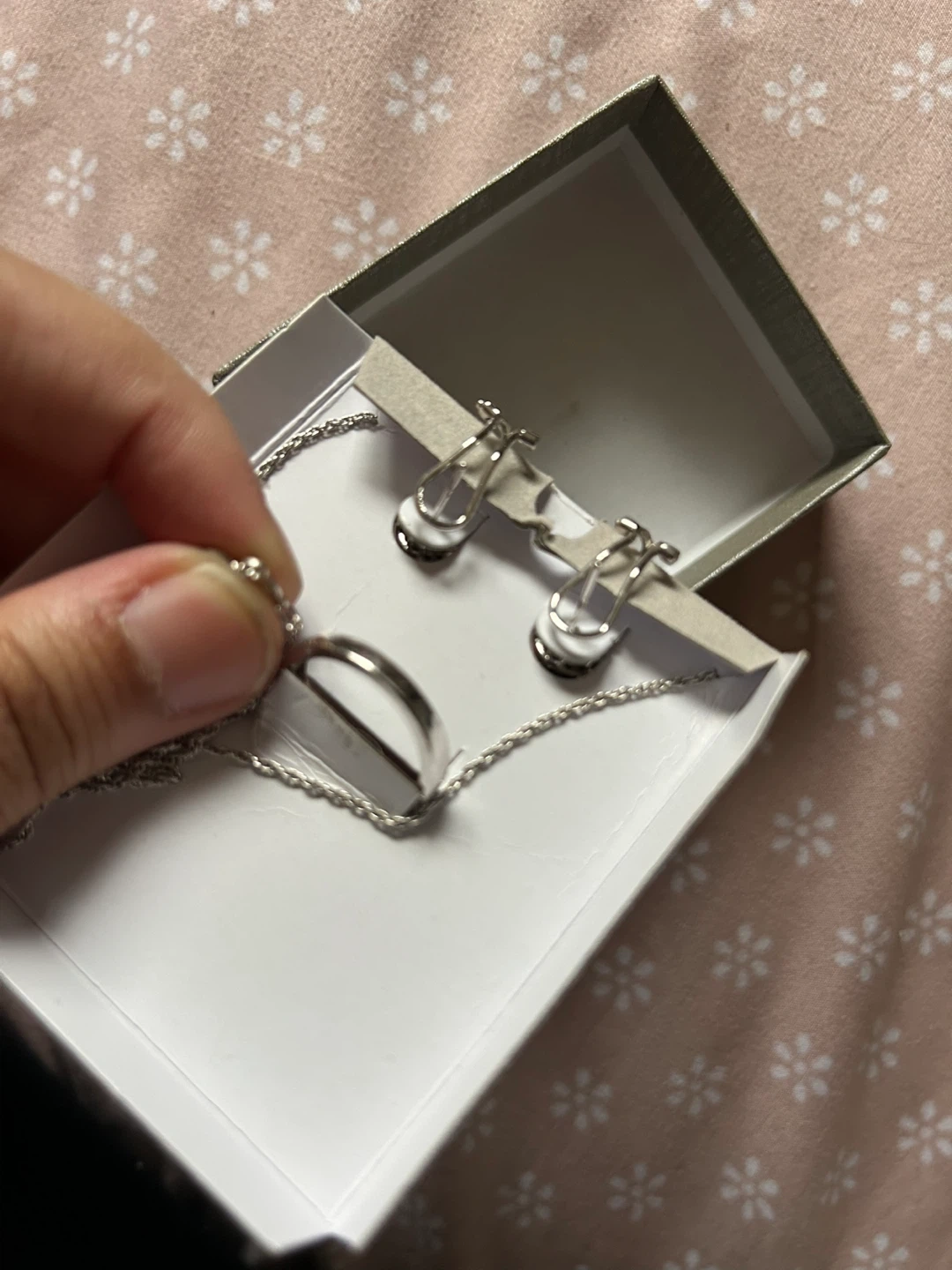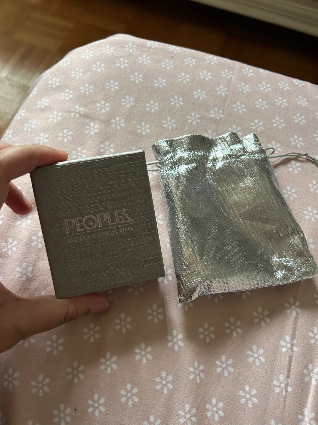 This is a three-piece jewellery set from Peoples Jewellers. It includes a necklace, a pair of earrings, and a ring. The set comes in its original box with a soft pouch. Would make a great gift. Purchased for around $150 from Peoples.
