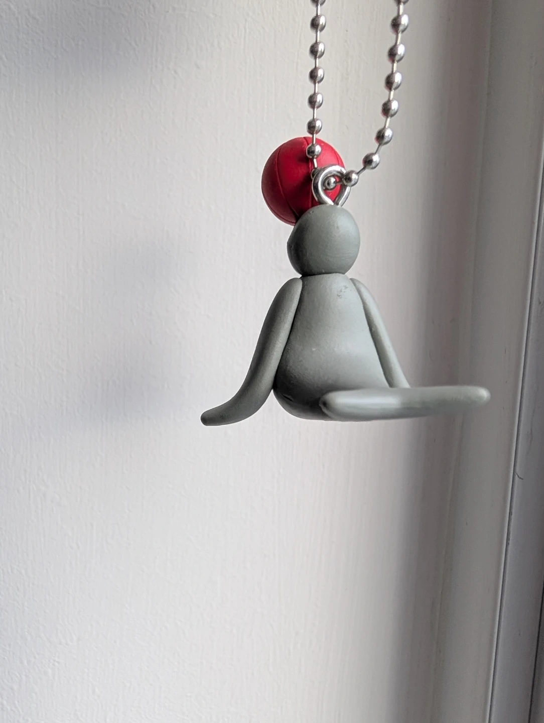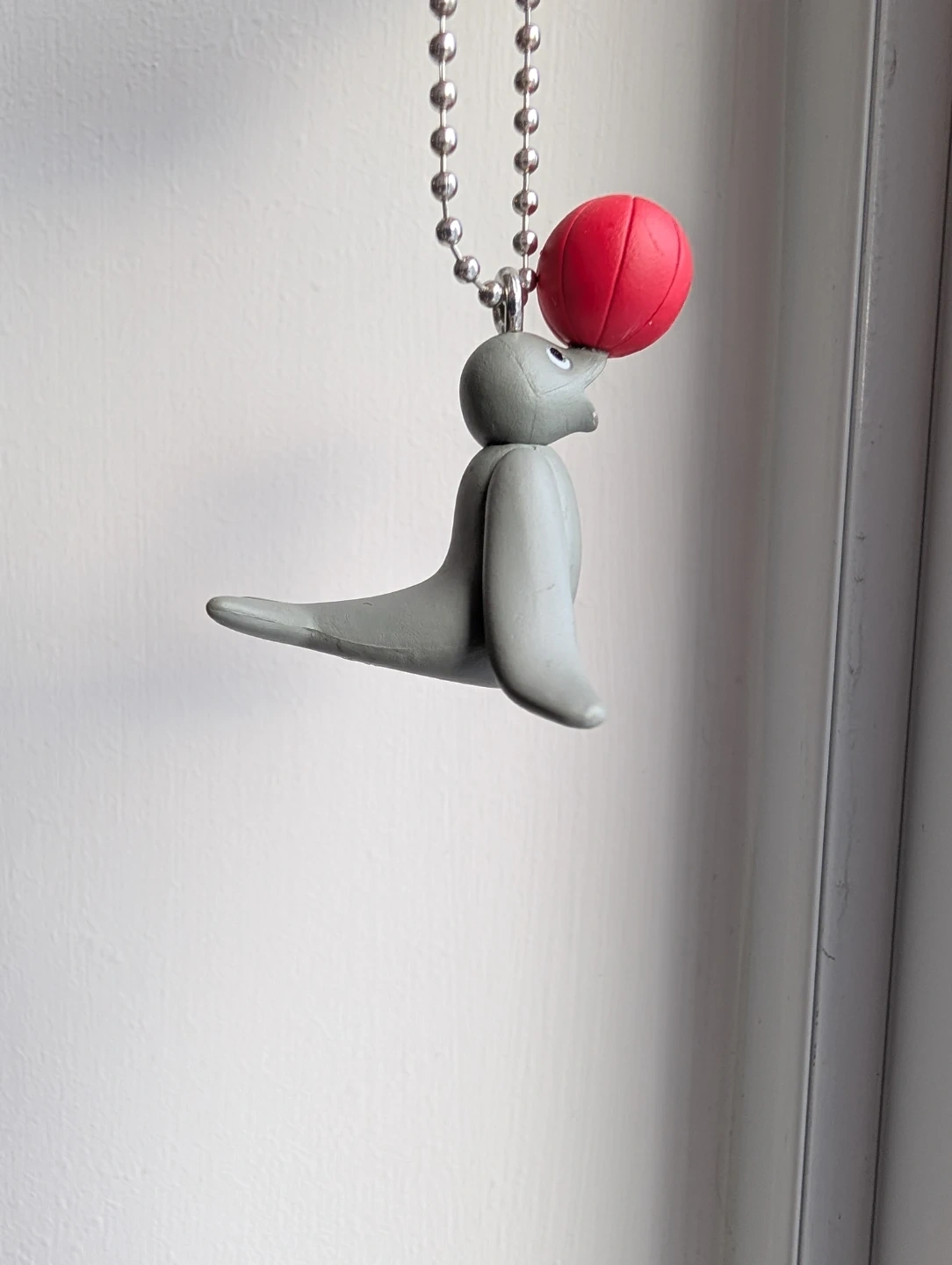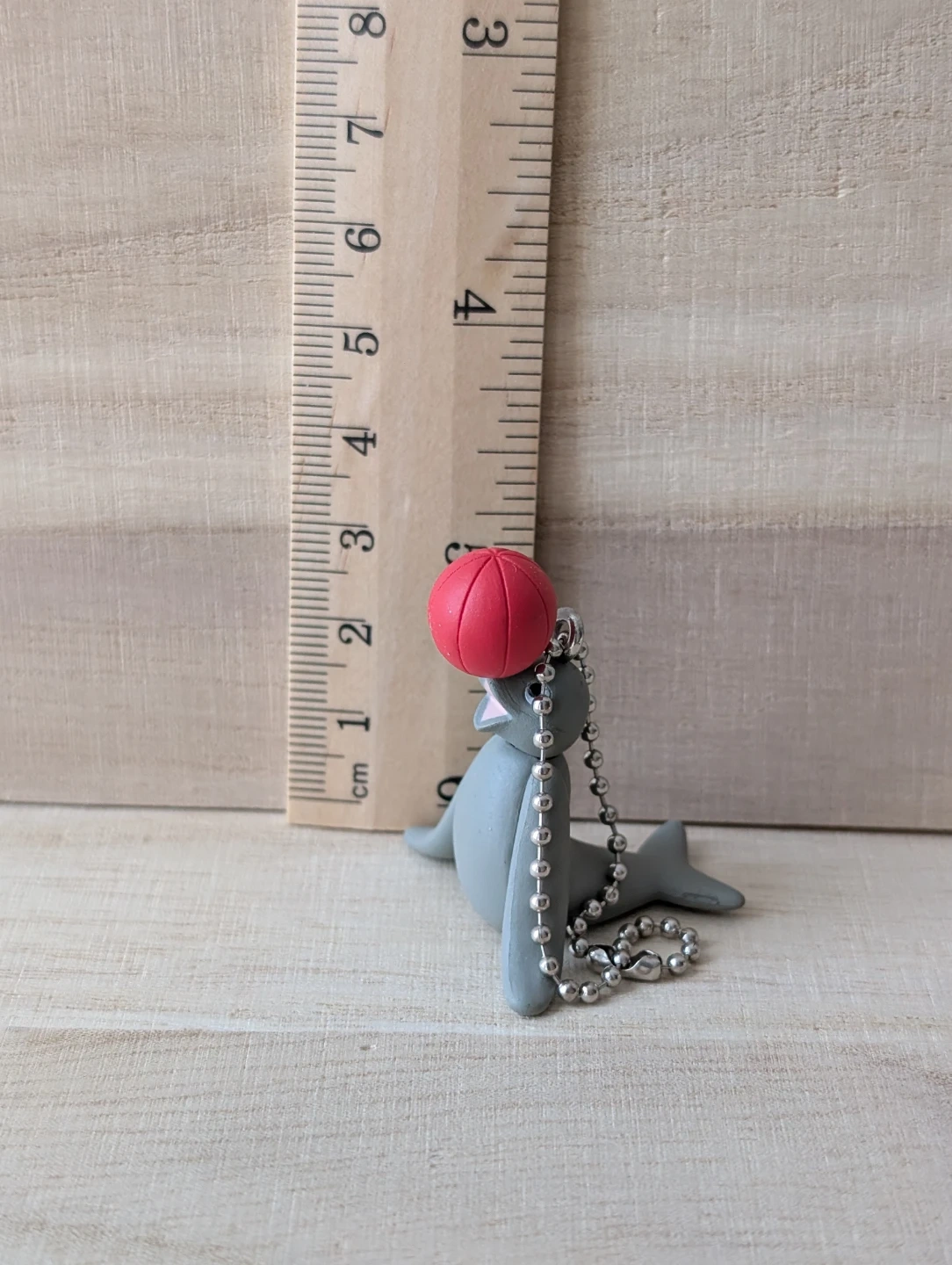 This is a cute grey seal keychain with a red ball balanced on its nose. It's attached to a silver ball chain. The seal figure is made of a smooth material. It's a fun little accessory!