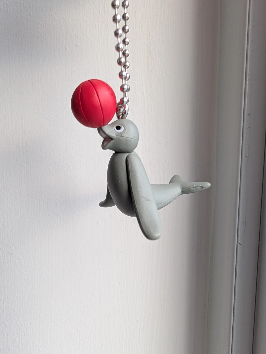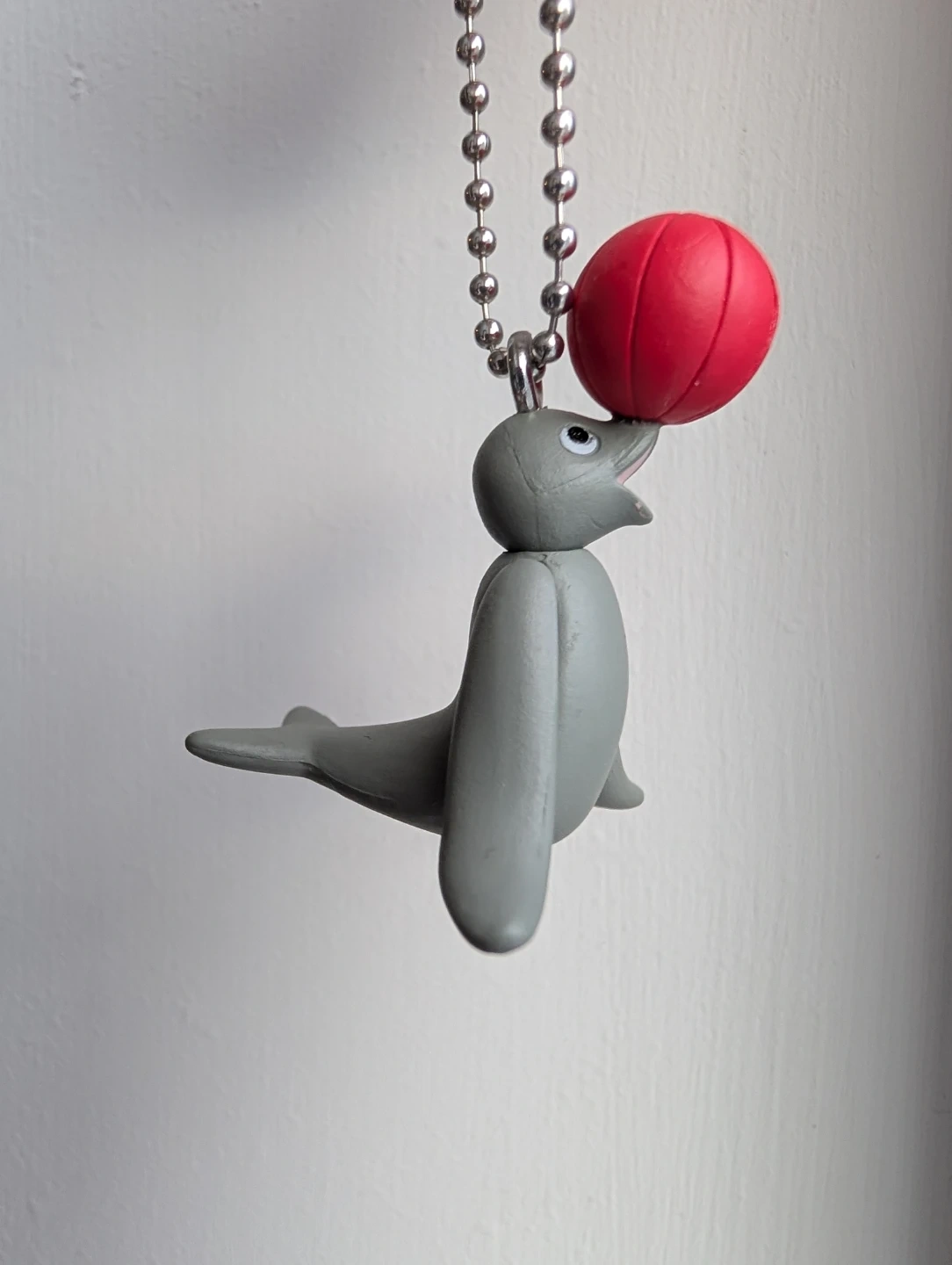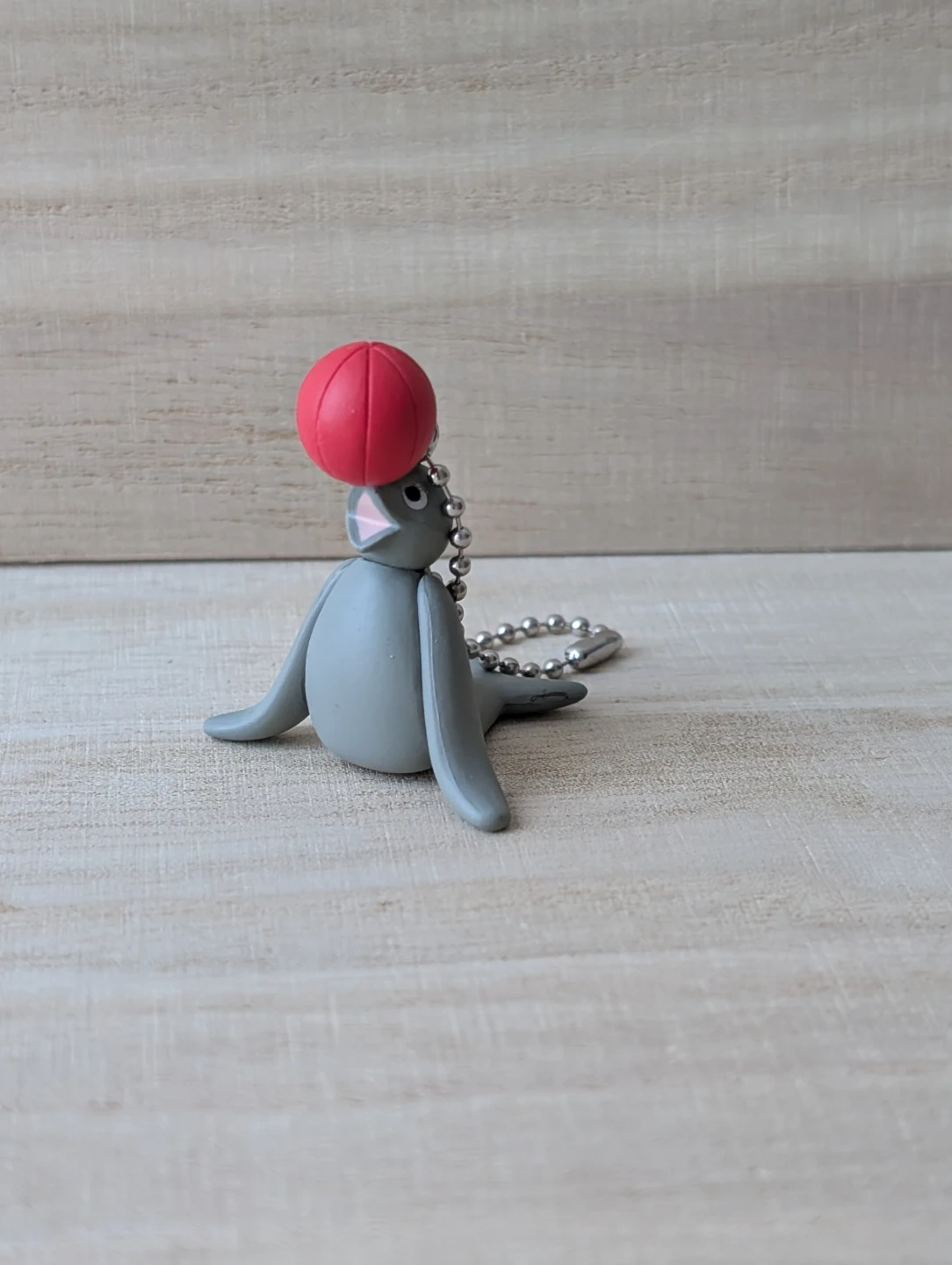 This is a cute grey seal keychain with a red ball balanced on its nose. It's attached to a silver ball chain. The seal figure is made of a smooth material. It's a fun little accessory!