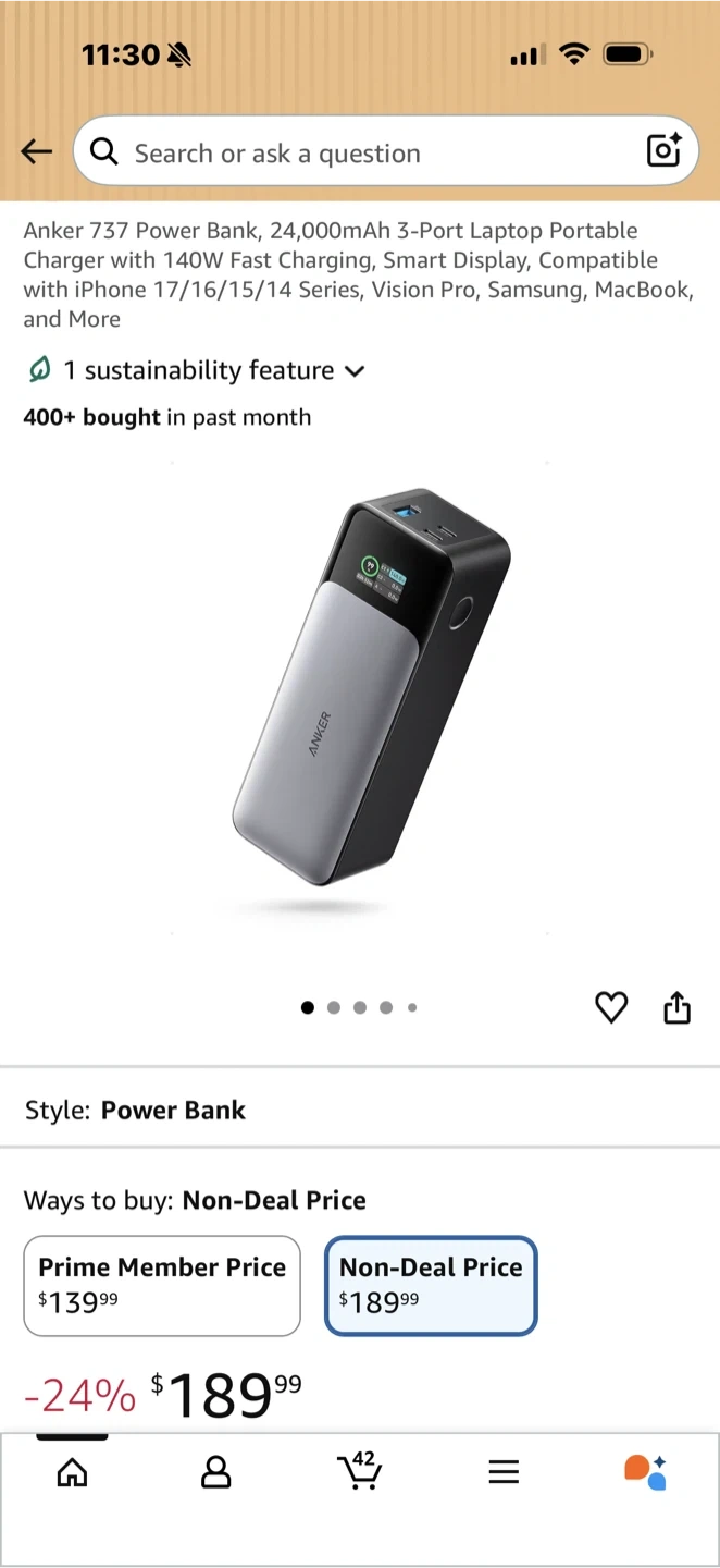 This is the Anker 737 Power Bank with a 24,000mAh capacity. It supports 140W fast charging and has a smart display. It's compatible with a wide range of devices including Apple, Samsung, HP, and more.