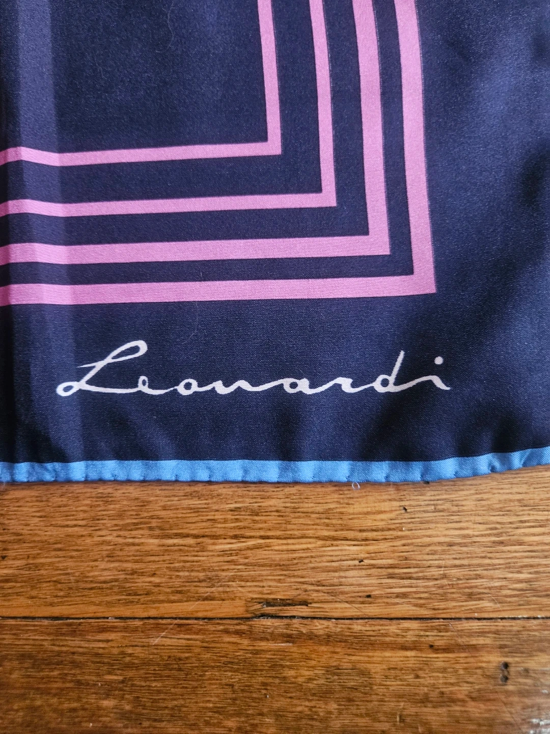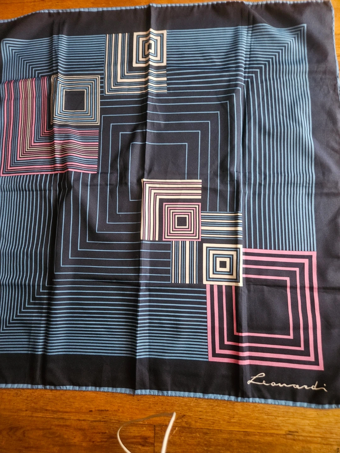 This is a Leonard Paris scarf featuring a geometric pattern. It's a stylish accessory with blue, pink, and white colors. The scarf's material appears to be silk.hand stitches.