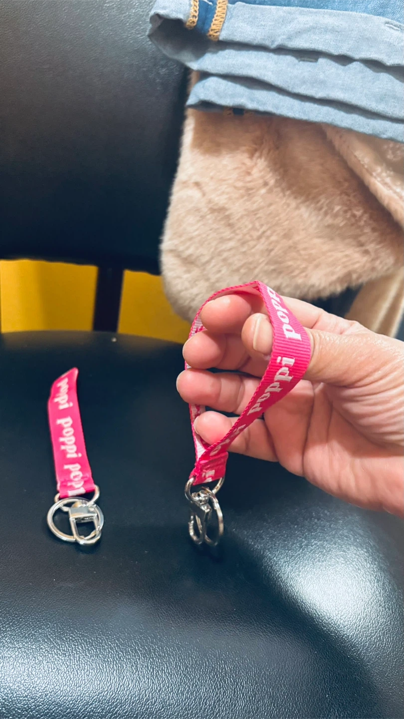 Set of two pink fabric keychain lanyards. Each features the repeating 'poppi poppi' text and includes a metal clasp and keyring. Great for keys or small accessories!
