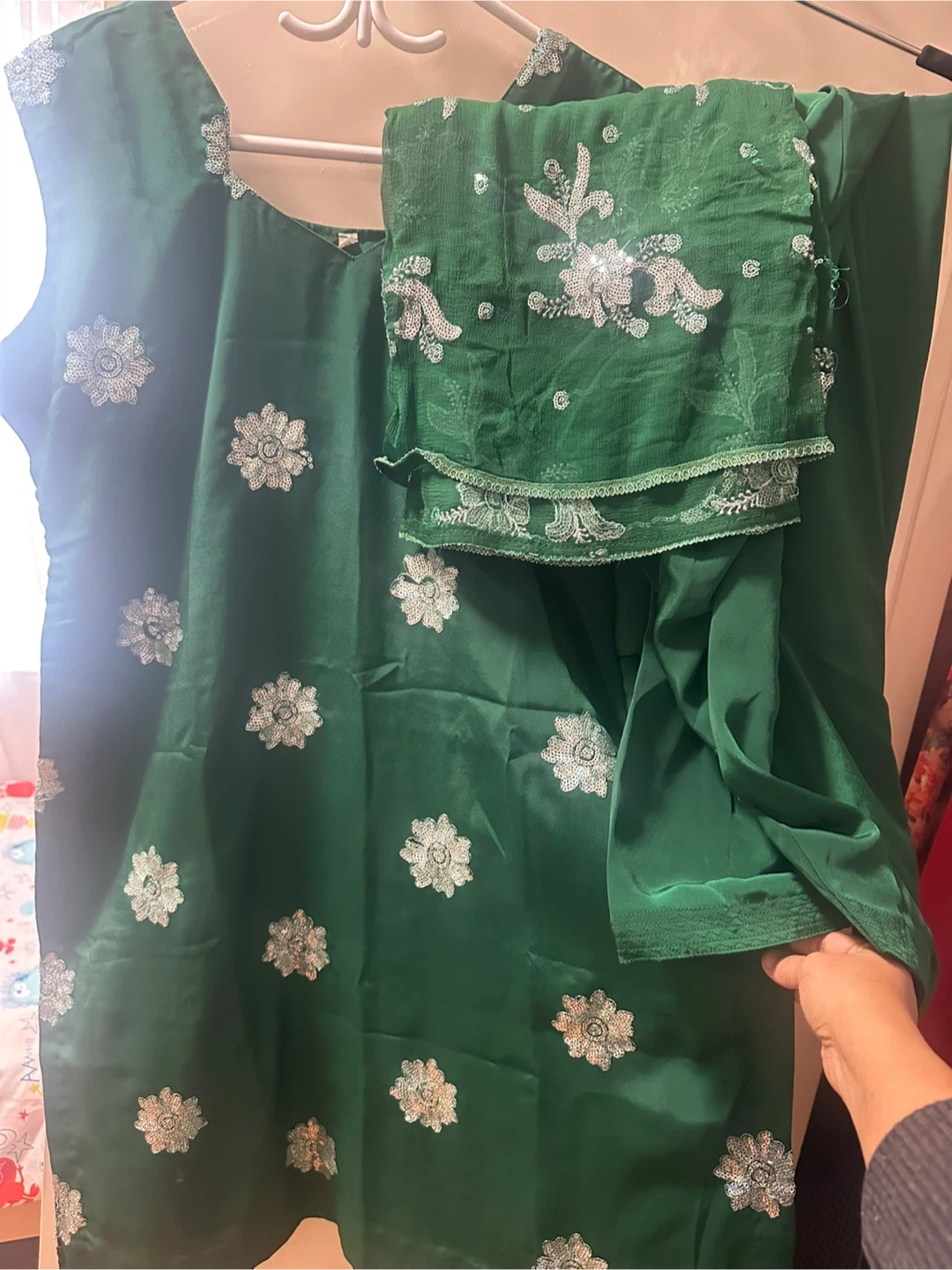Selling a beautiful green salwar kameez suit. It features lovely embroidery and is perfect for special occasions or everyday wear. The fabric feels nice and comfortable. Comes with the top, bottom, and matching dupatta! New, never wear. Size 48. But can be make any size.