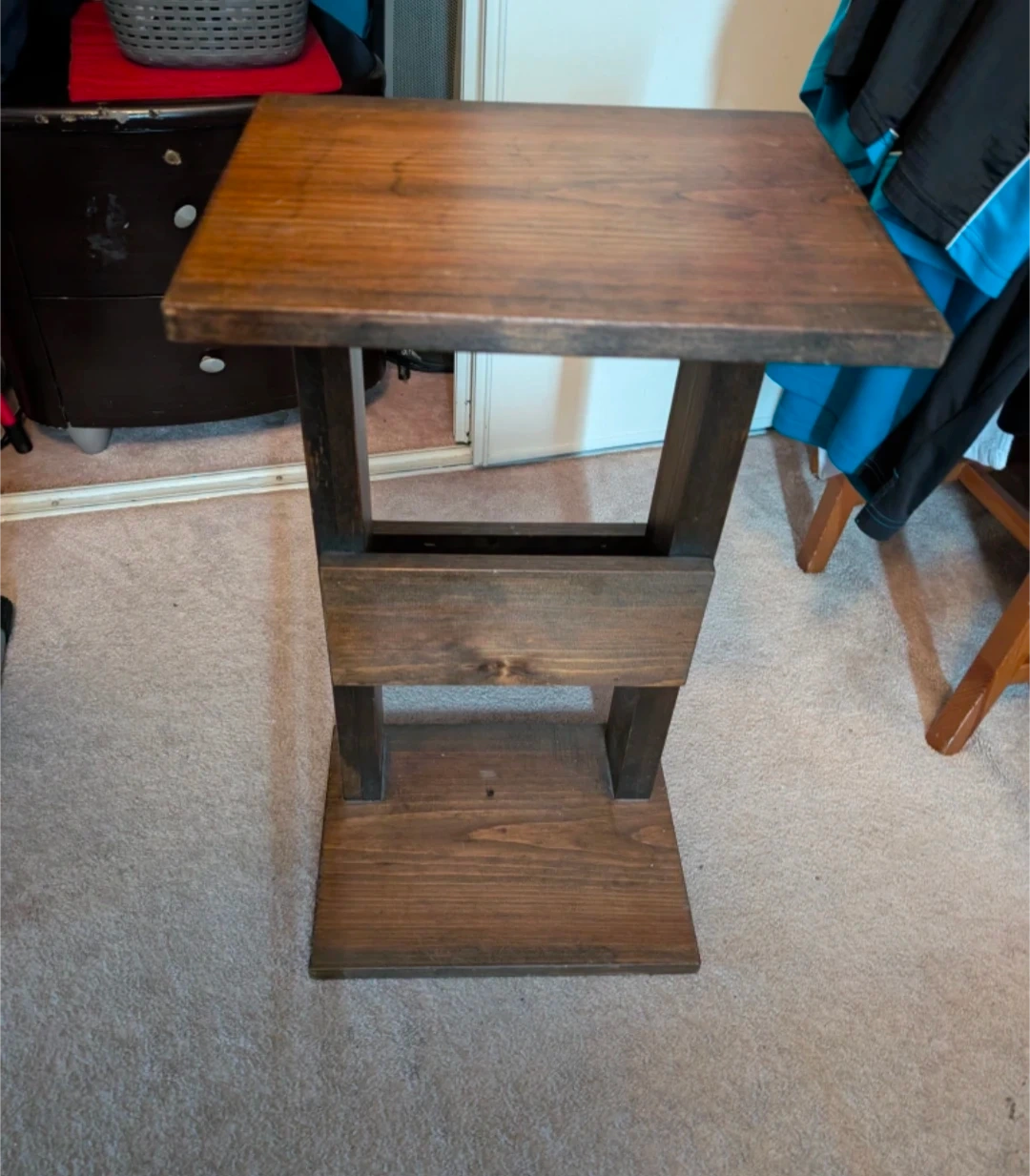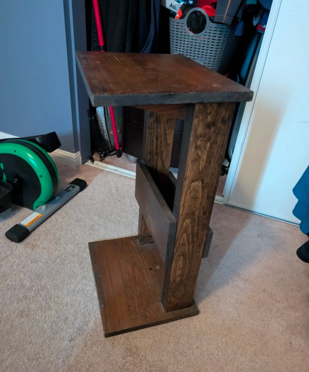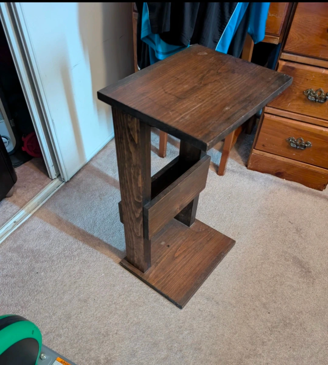 Selling a charming brown wooden side table! It features a built-in magazine rack, perfect for keeping your reading materials organized and within easy reach. Dimension: 14L x 11W x 26H This table is a great addition to any living room or bedroom, adding both style and functionality