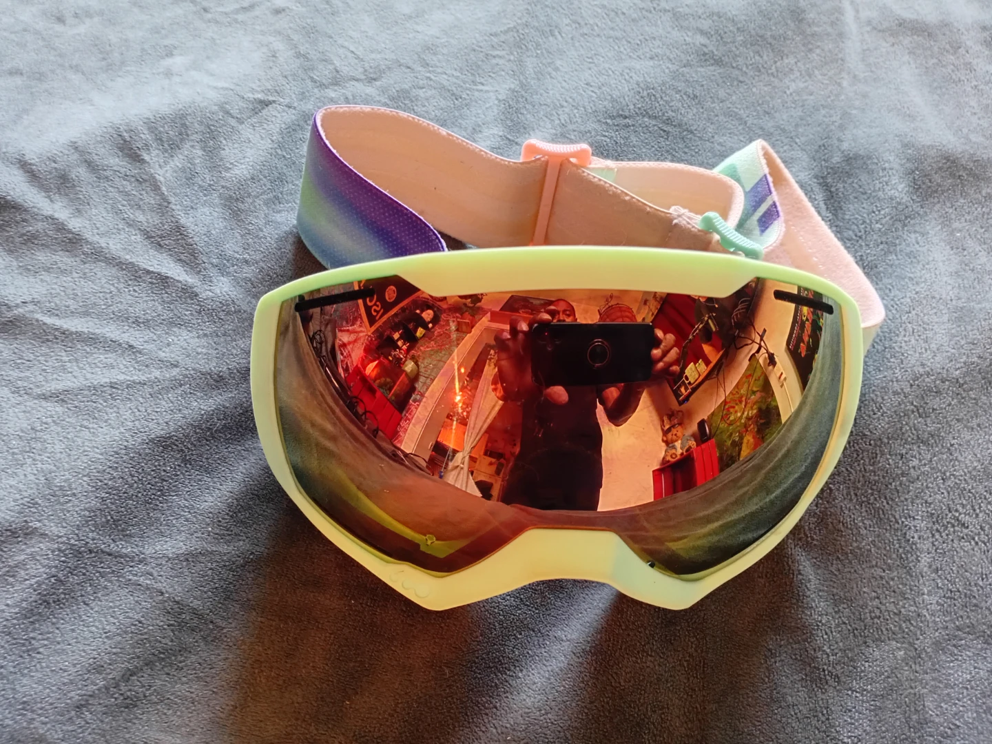 These ski goggles feature a bright, lime green frame and a colourful rainbow strap. The lens has a mirrored, orange-red tint. They're designed for winter sports. The adjustable strap ensures a snug fit for various head sizes.