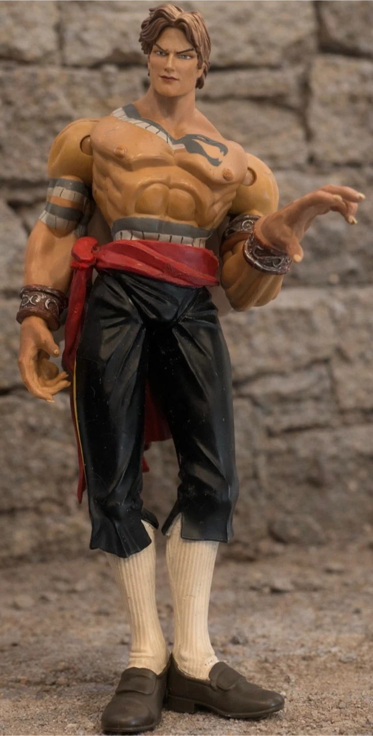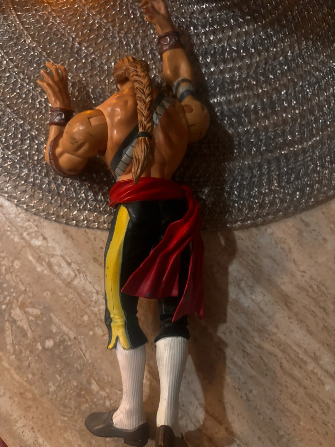 Authentic Capcom fighting-game action figure featuring a muscular martial artist with blond braided hair, chest markings, red sash, and articulated limbs. From the early 2000s era of Capcom/Street Fighter collectible figures.