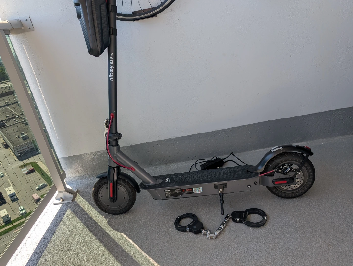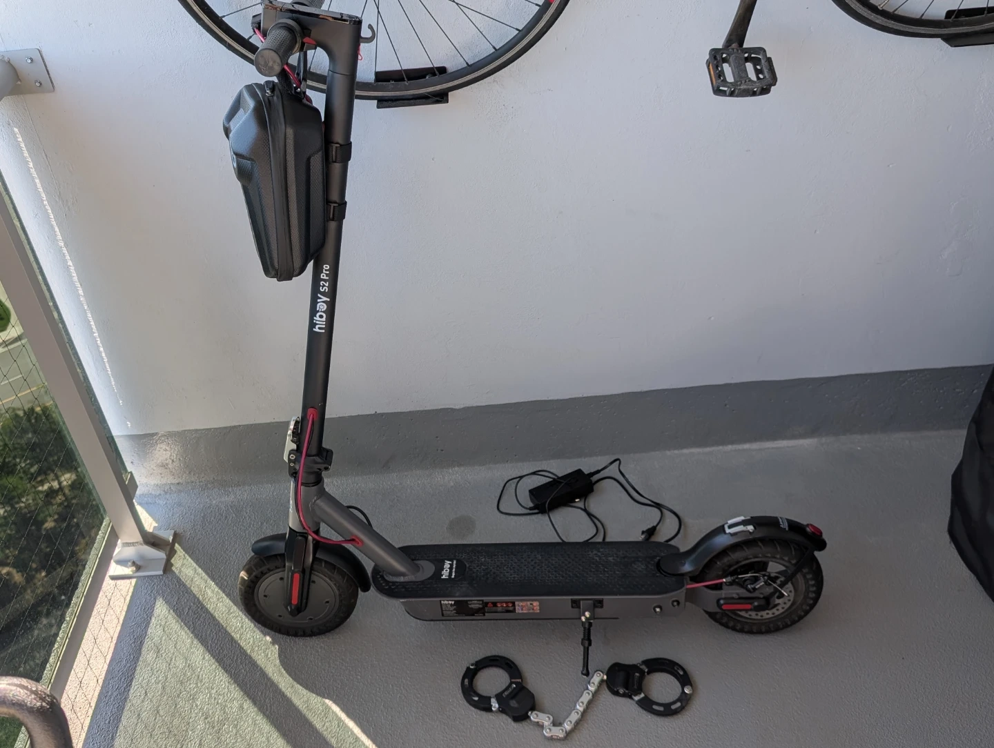Hiboy S2 Pro electric scooter. Comes with charger and a handlebar storage bag. It's grey with red accents. Great for getting around town!