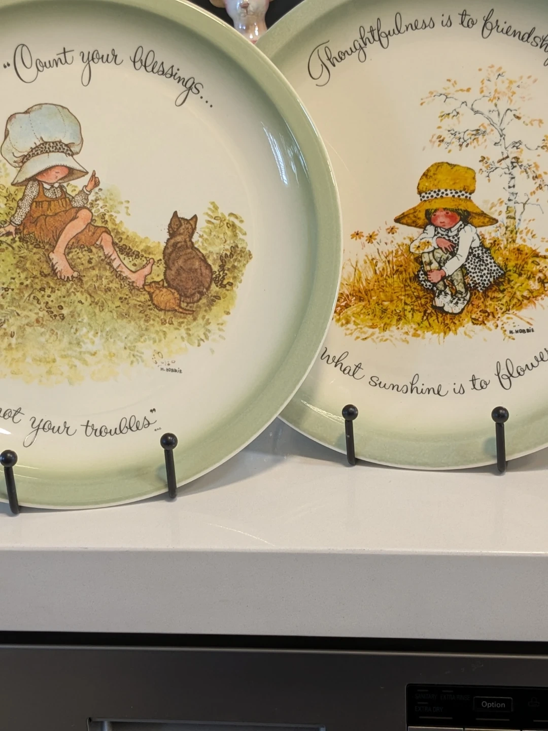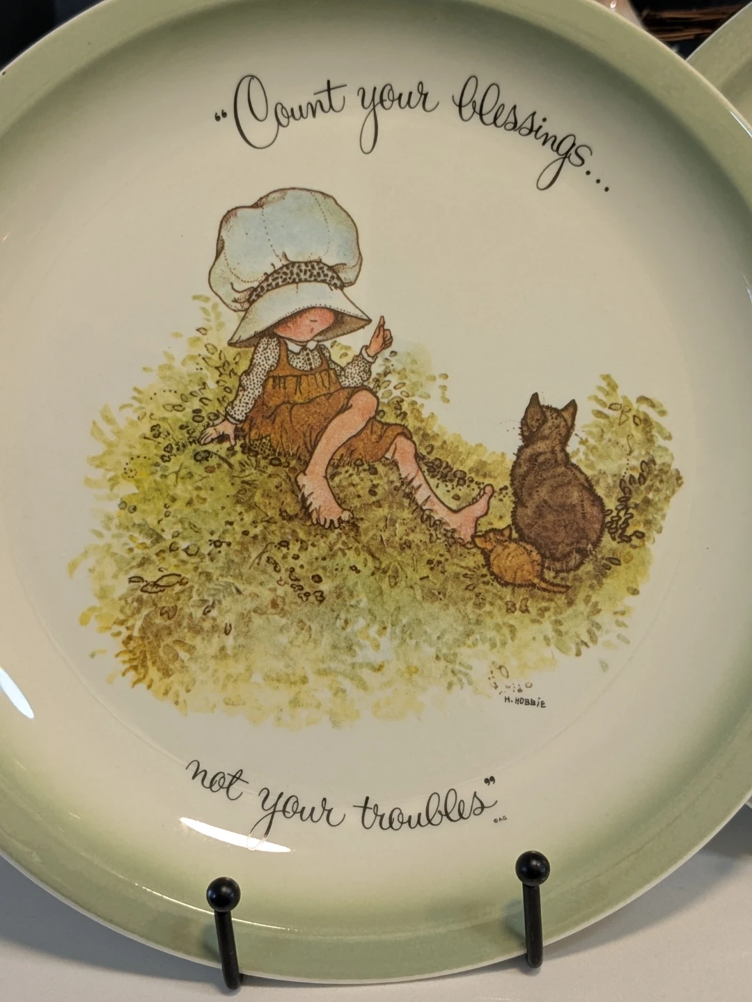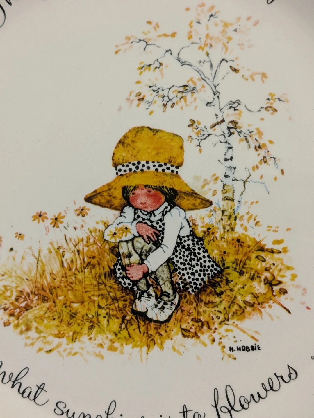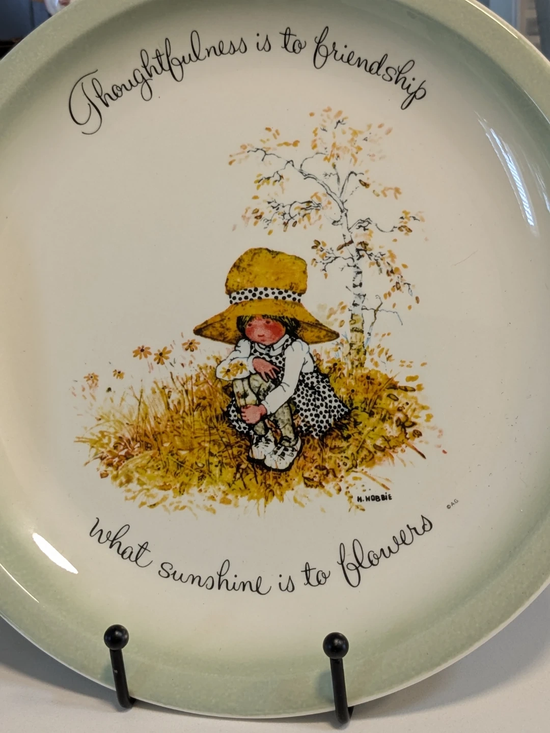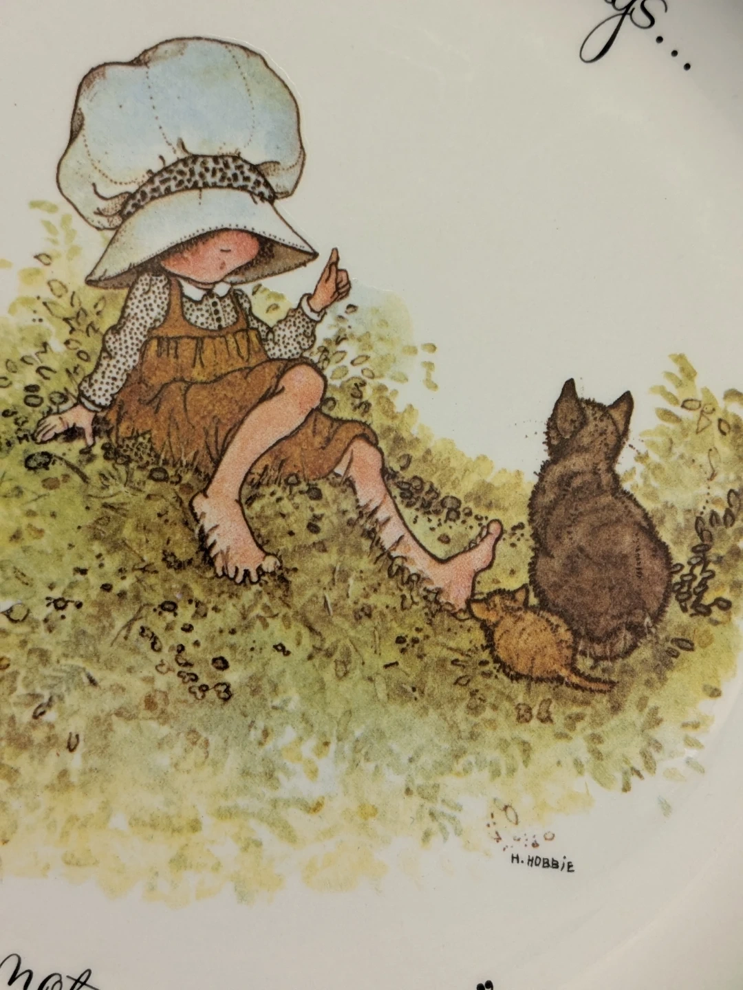 This set includes two decorative plates featuring H. Hobbie artwork. One plate shows a girl with a cat, and the other depicts a girl under a tree. Both have uplifting quotes. They're lovely pieces for display!