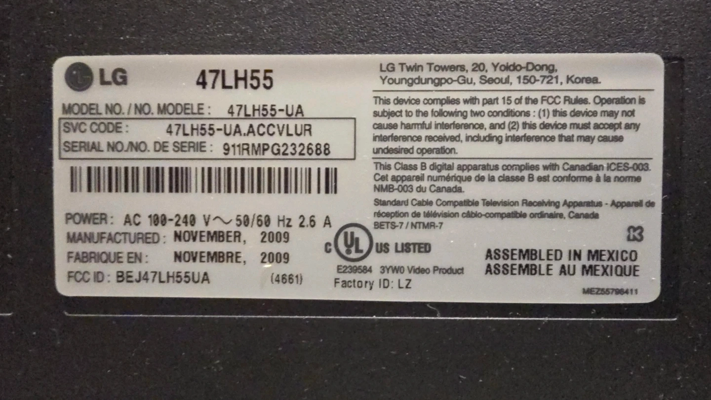 LG 47LH55 47-inch LCD TV manufactured in November 2009. It comes with multiple input options including HDMI, AV, and PC. This television is a great addition for any media setup.