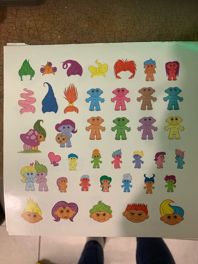 I'm selling a vintage Troll themed sticker book in used condition. The pages are filled with a variety of colourful Troll themed stickers, perfect for crafts. Please review the images for specific details on the condition. These stickers are ready to bring a touch of nostalgia to your collection! Cash accepted.