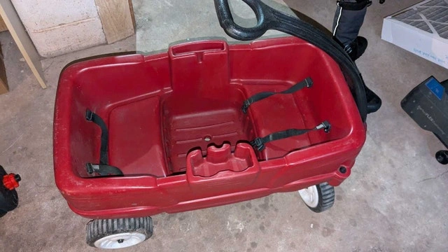 This is a used Kids Wagon, perfect for hauling kids or cargo with a sturdy build and classic design. It has a durable plastic body, a comfortable handle for easy pulling, and is ready for new adventures. There are some scuffs and signs of wear, but it is still fully functional and ready for many more years of use. It's a fun chariot for little ones, making mundane tasks feel like a grand parade! If the ad's up, the wagon's ready for a new home!