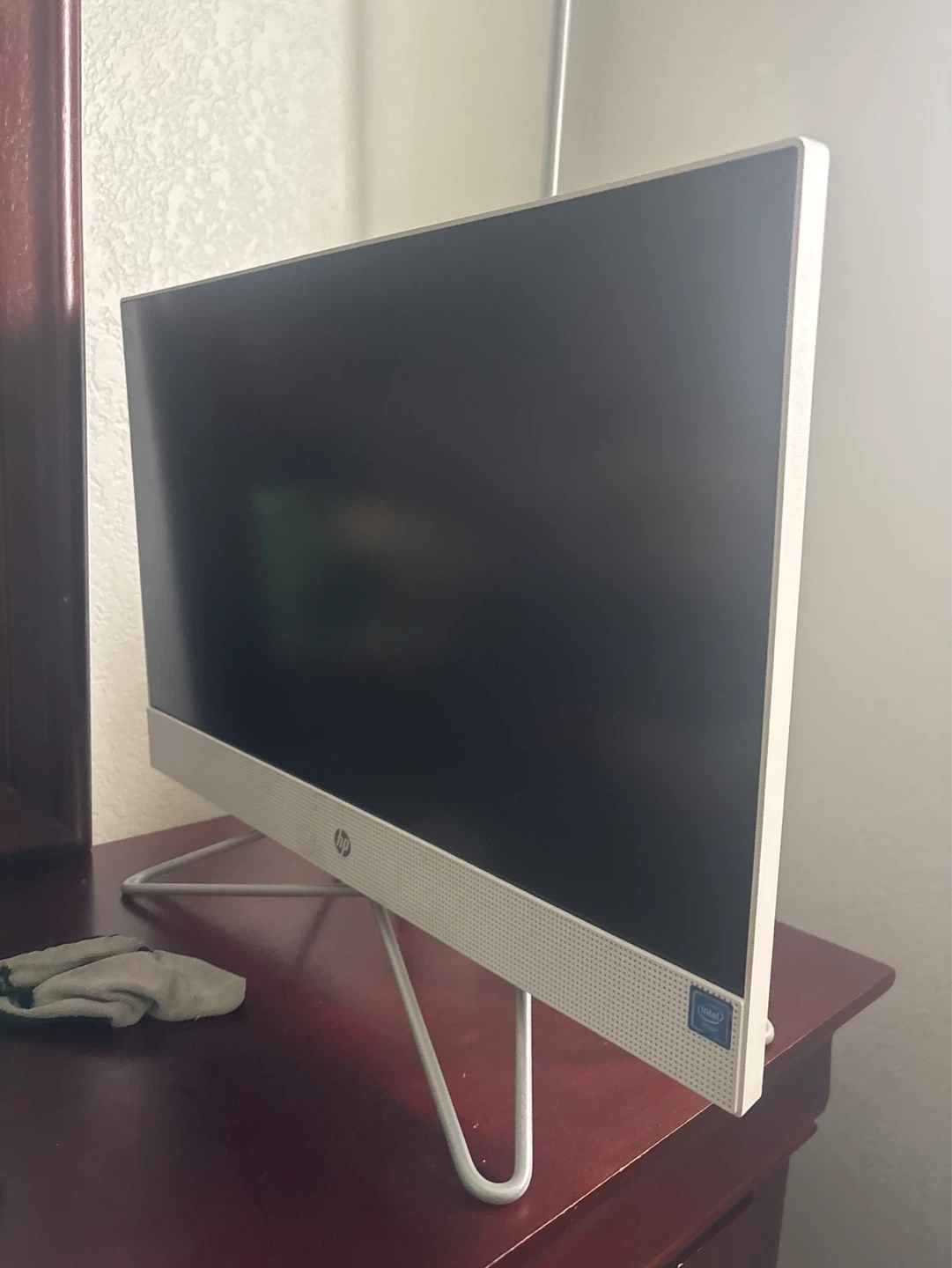 This is an HP All-in-One desktop computer. It's white and has a sleek, modern design. Great for a home office or student setup!