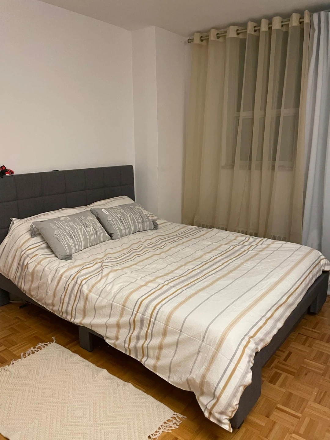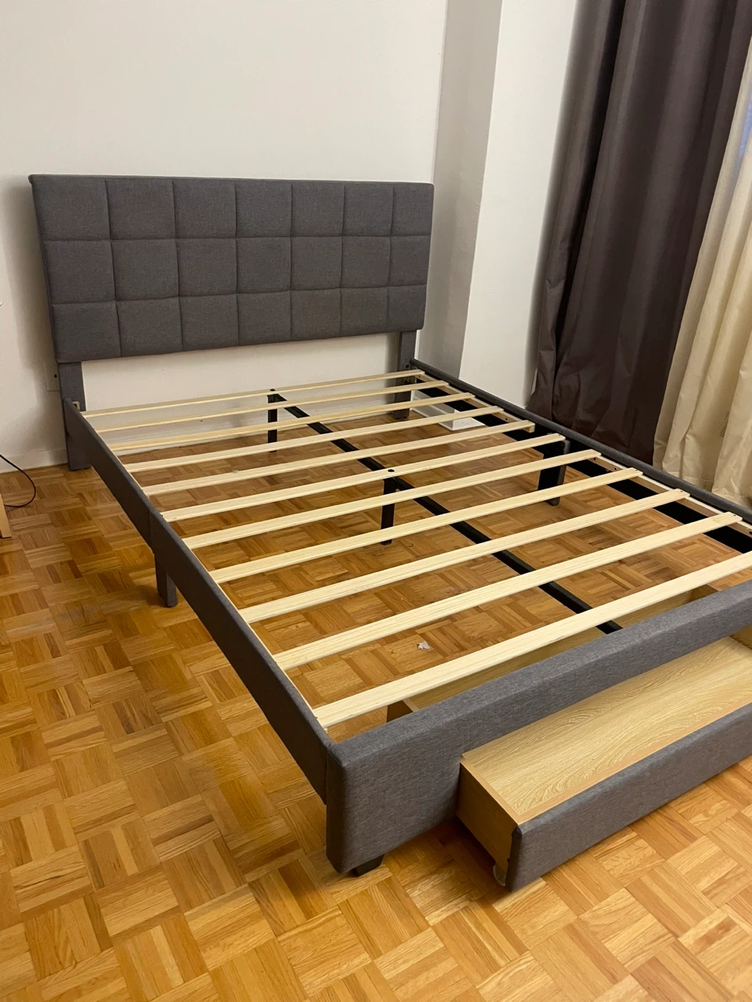 Selling a grey upholstered bed frame. It's in great shape! The frame has a modern, clean look that would fit well in any bedroom. Easy to assemble and disassemble for moving