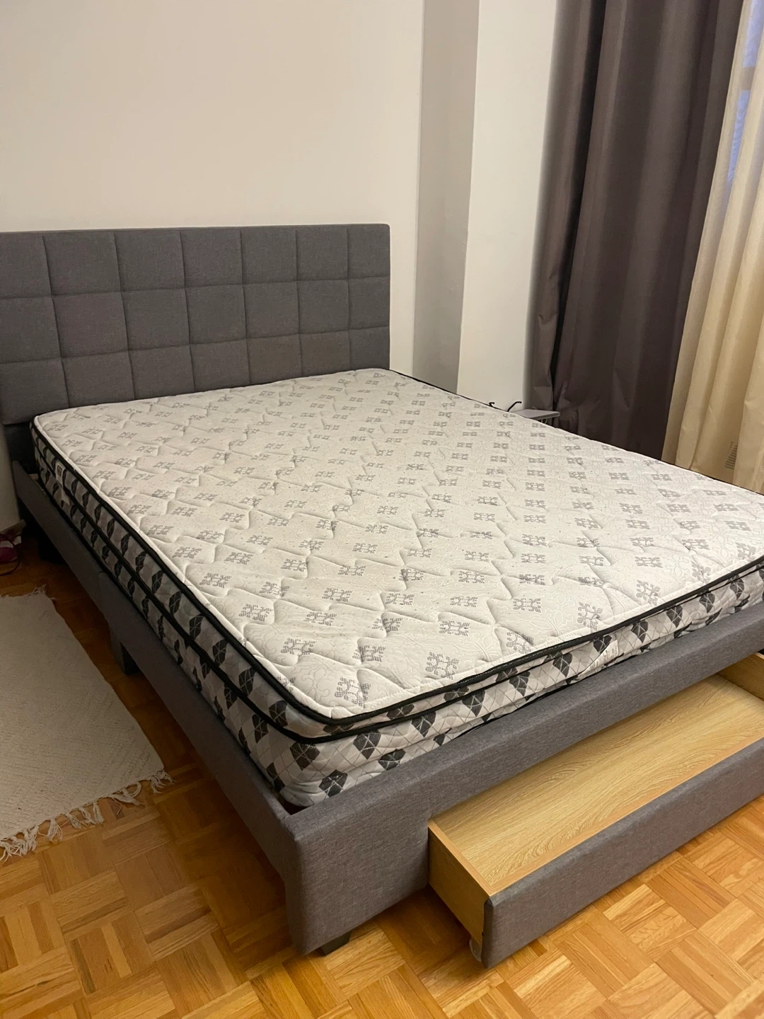 Selling a grey upholstered bed frame. It's in great shape! The frame has a modern, clean look that would fit well in any bedroom. Easy to assemble and disassemble for moving