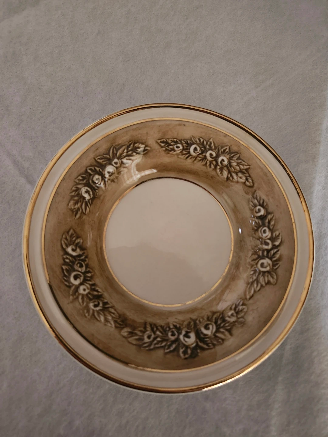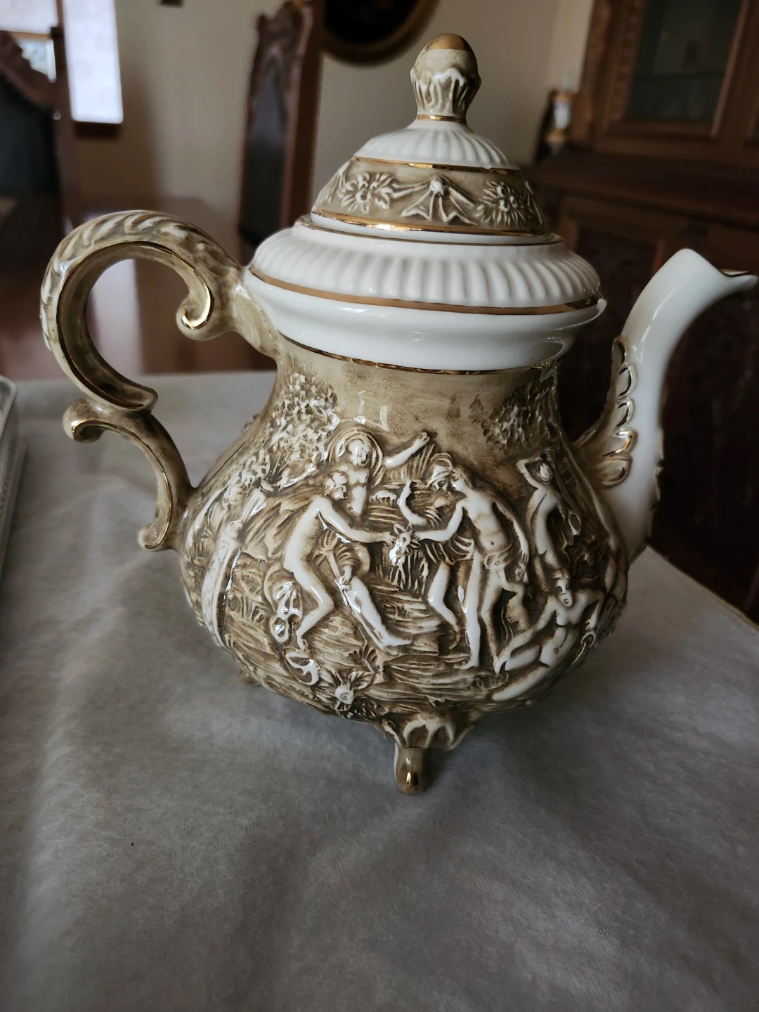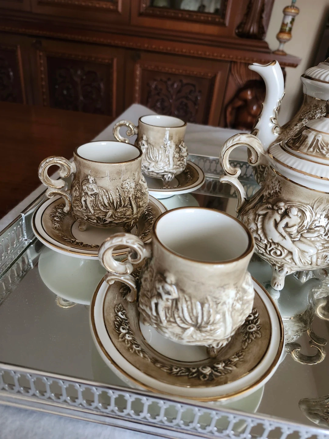 This 19 piece set has been in our family for 45+ years and has never been used. It's been displayed in our dining room cabinet. Set includes 6 coffee cups, 6 saucers, cream and sugar set with lids, coffee pot with lid, and mirrored tray. Cherub design in neutral colors. Prestine condition, no chips, like new. Smoke free, pet free home.
