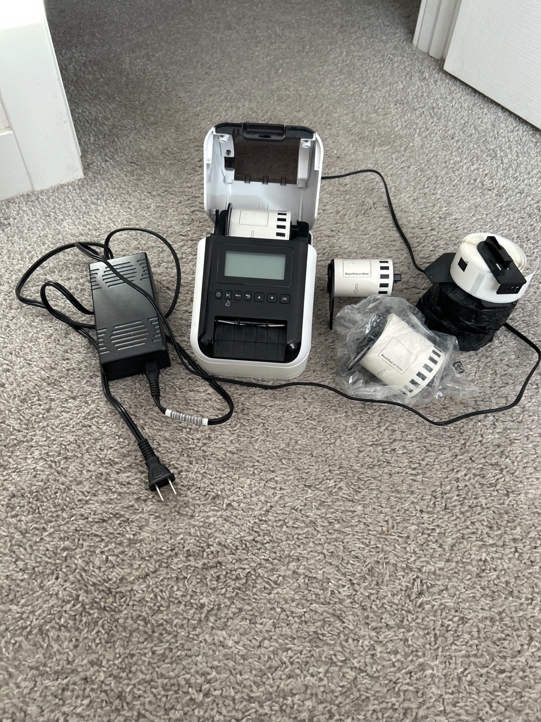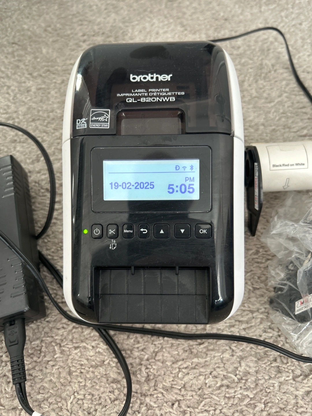 Brother QL-820NWB label printer. Includes power adapter and extra label tapes. Ready to use.