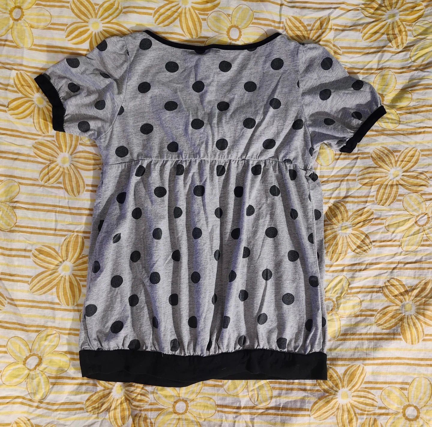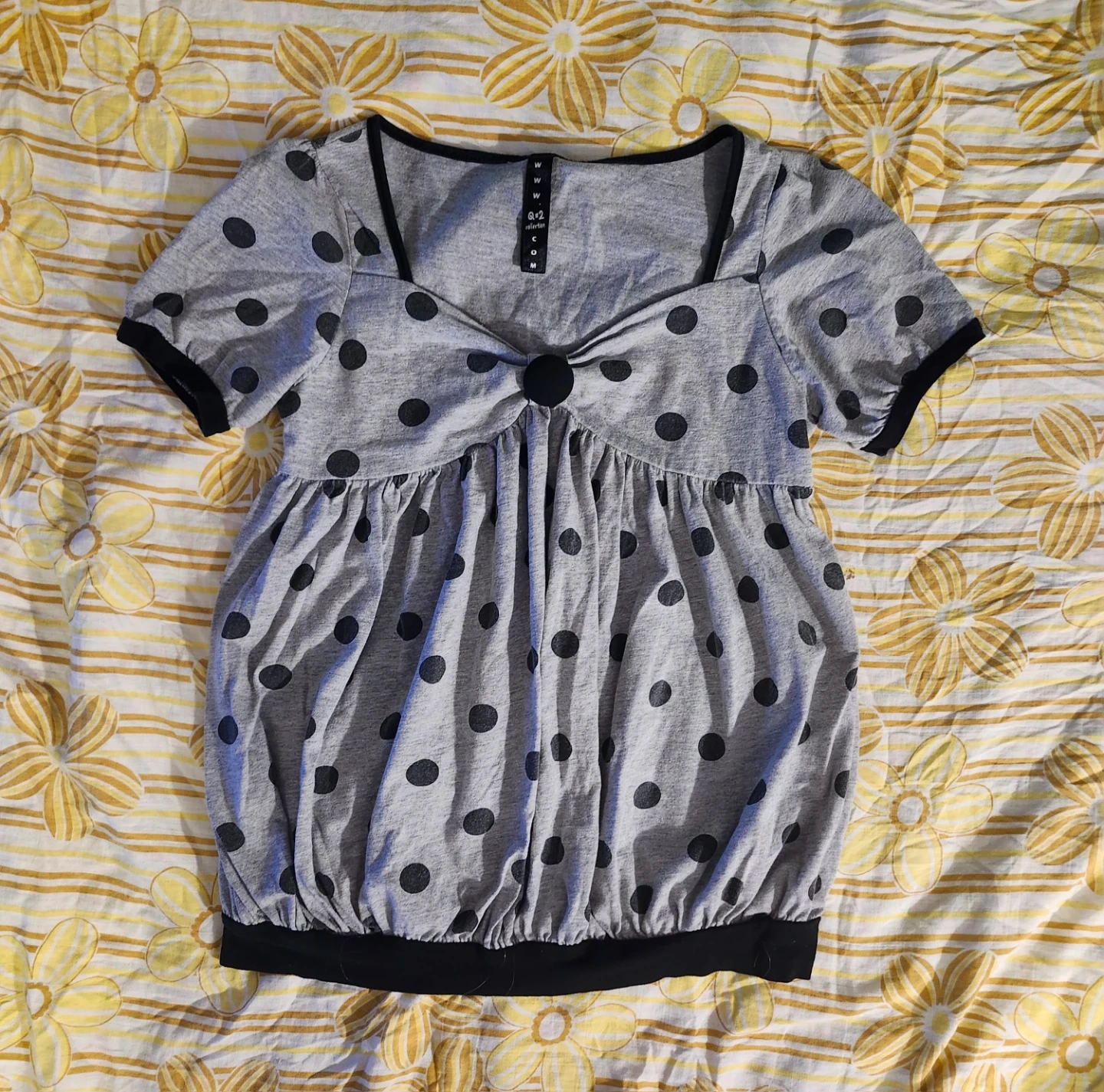 Grey and black polka dot babydoll top with button