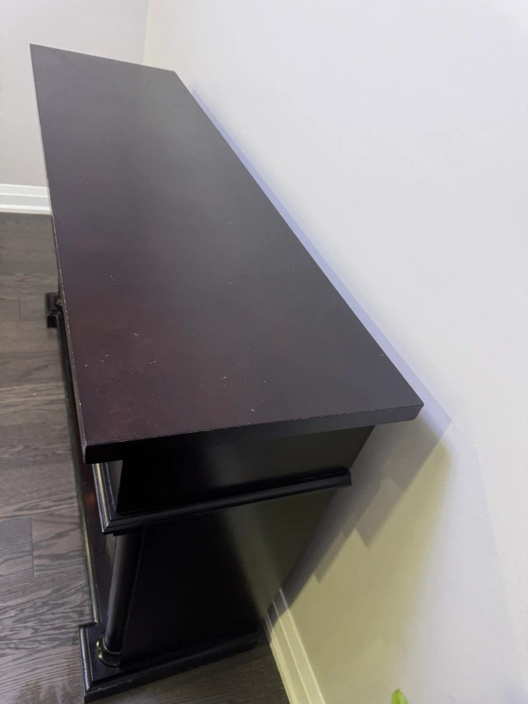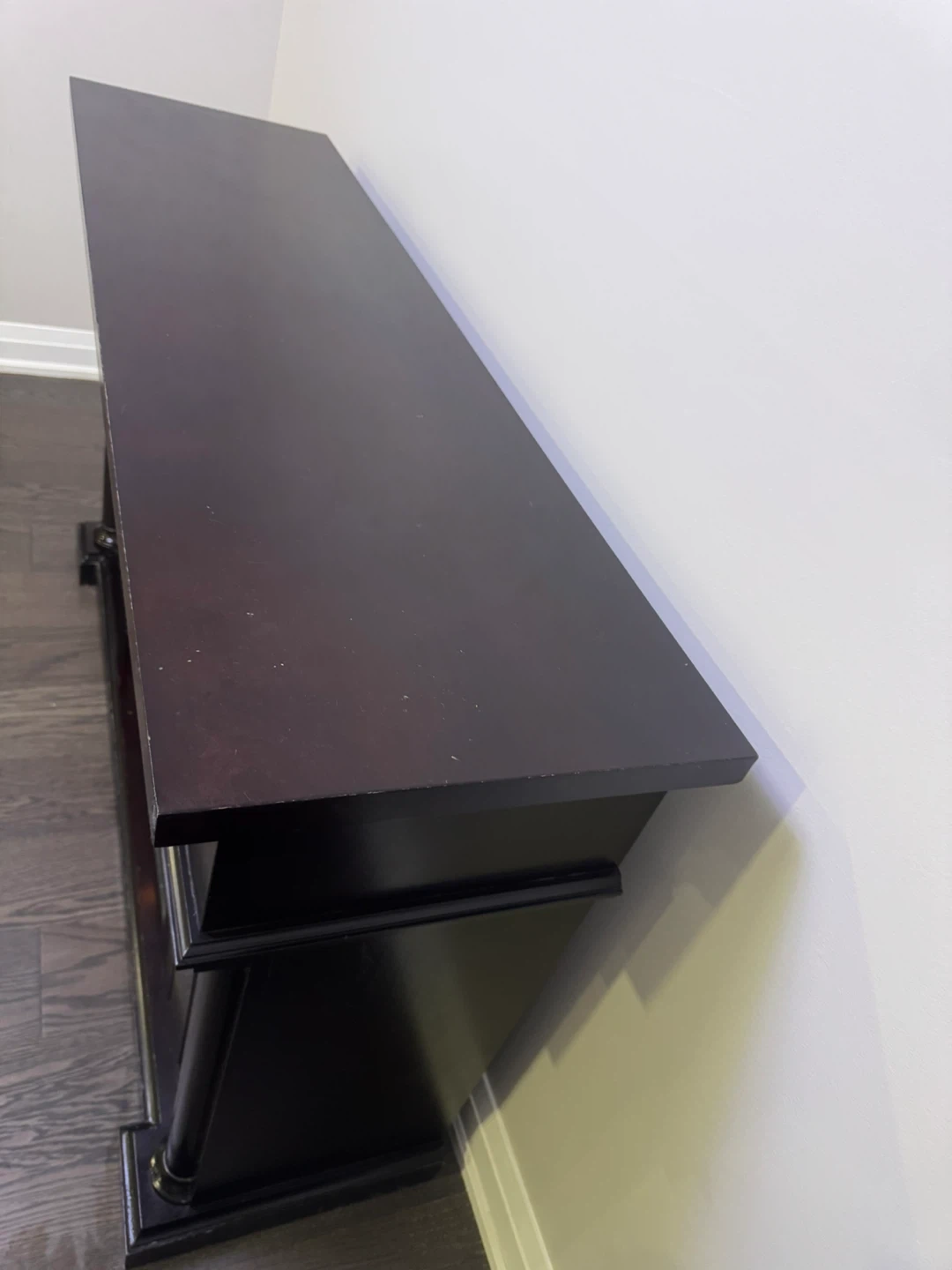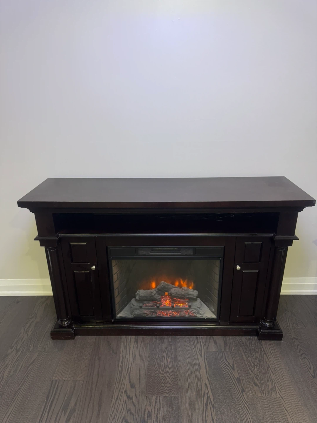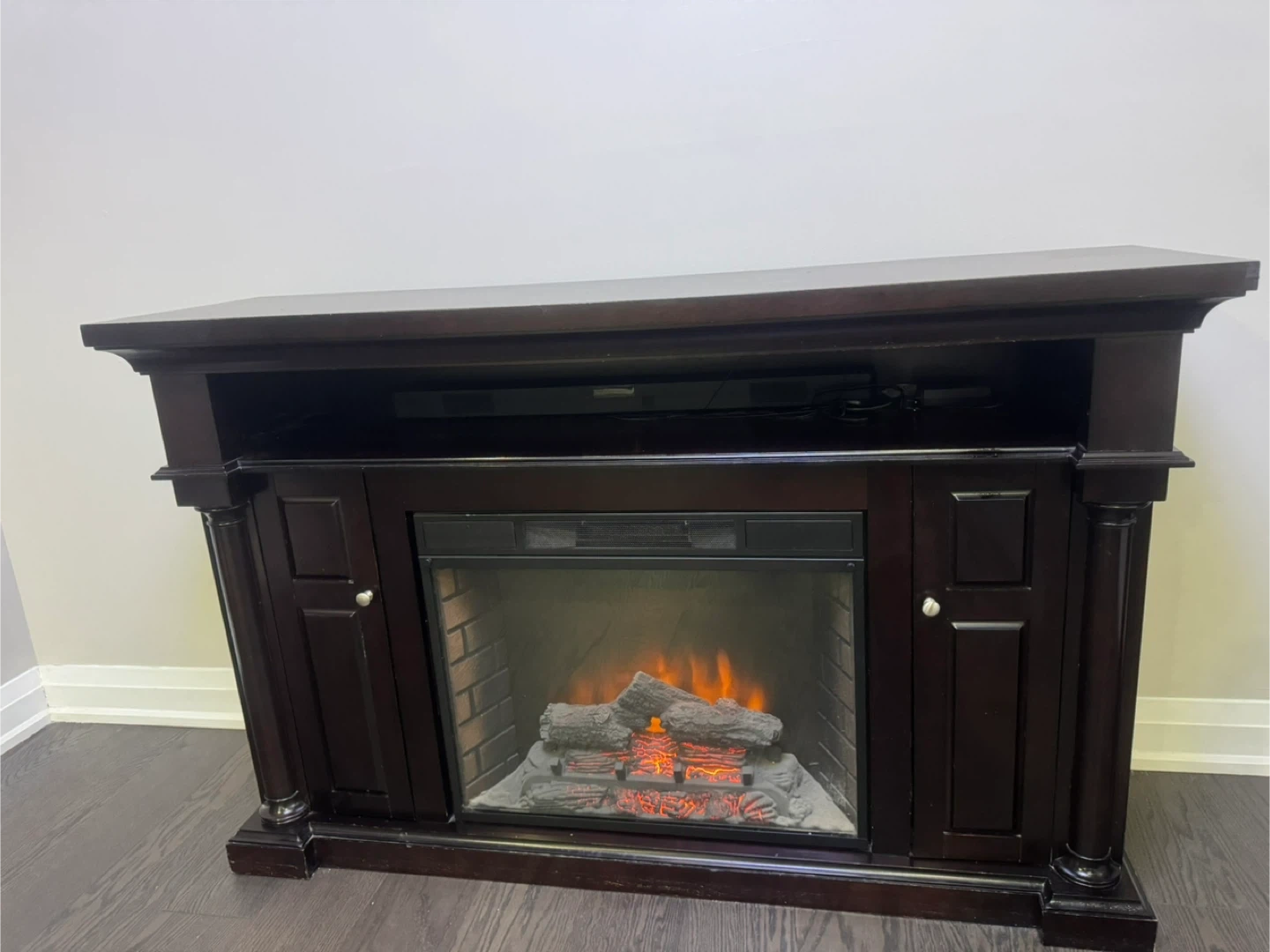 Selling a dark brown electric fireplace TV stand. It's in good condition and adds a cozy touch to any room! The fireplace feature works great and provides extra warmth during the colder months. It's perfect for holding your TV and media consoles