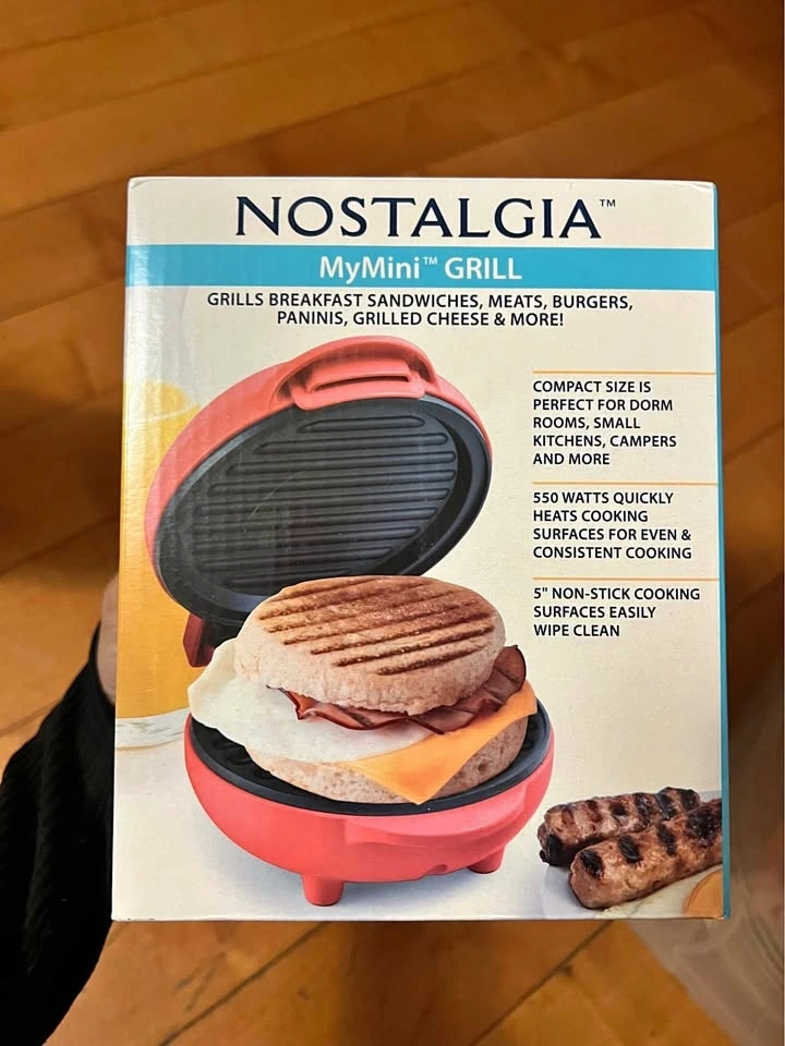 Brand new mini grill by Nostalgia. Compact, stylish, and super easy to use. Perfect for burgers, sandwiches, or quick meals. Great for small spaces, students, or cozy cooking at home. Eye-catching red design β also a great gift idea. Easy to clean and store. Bundle deal available if you buy with other items.