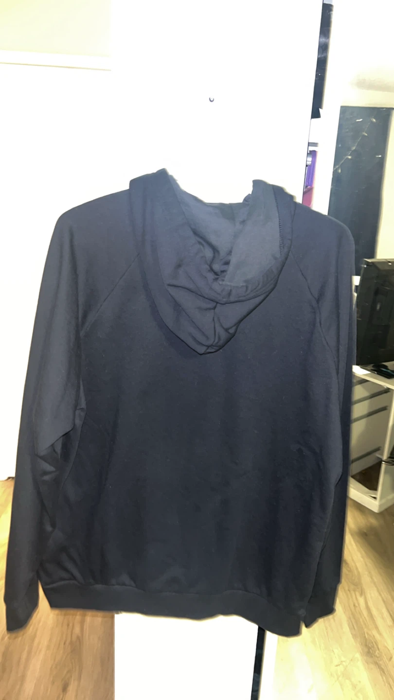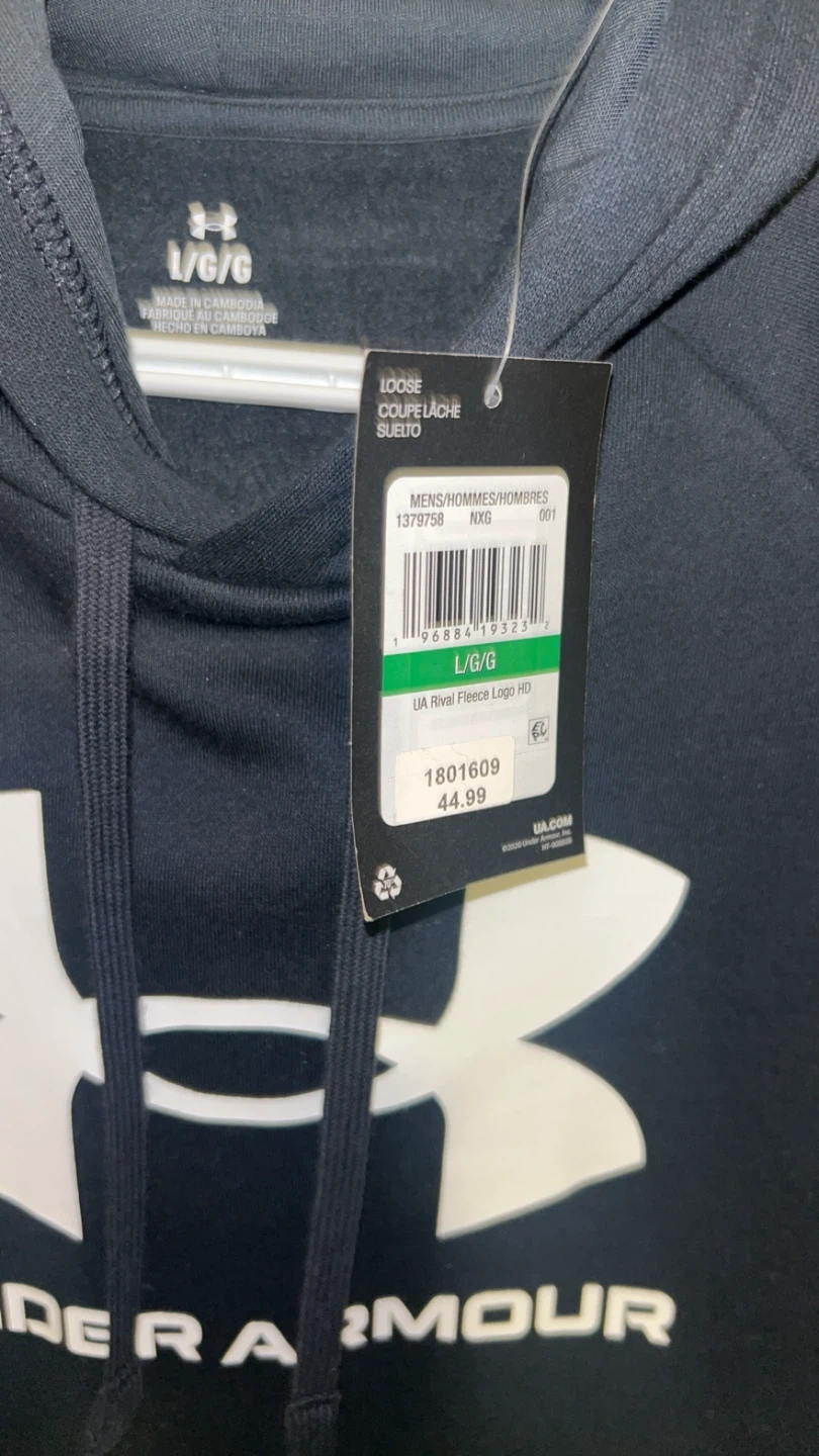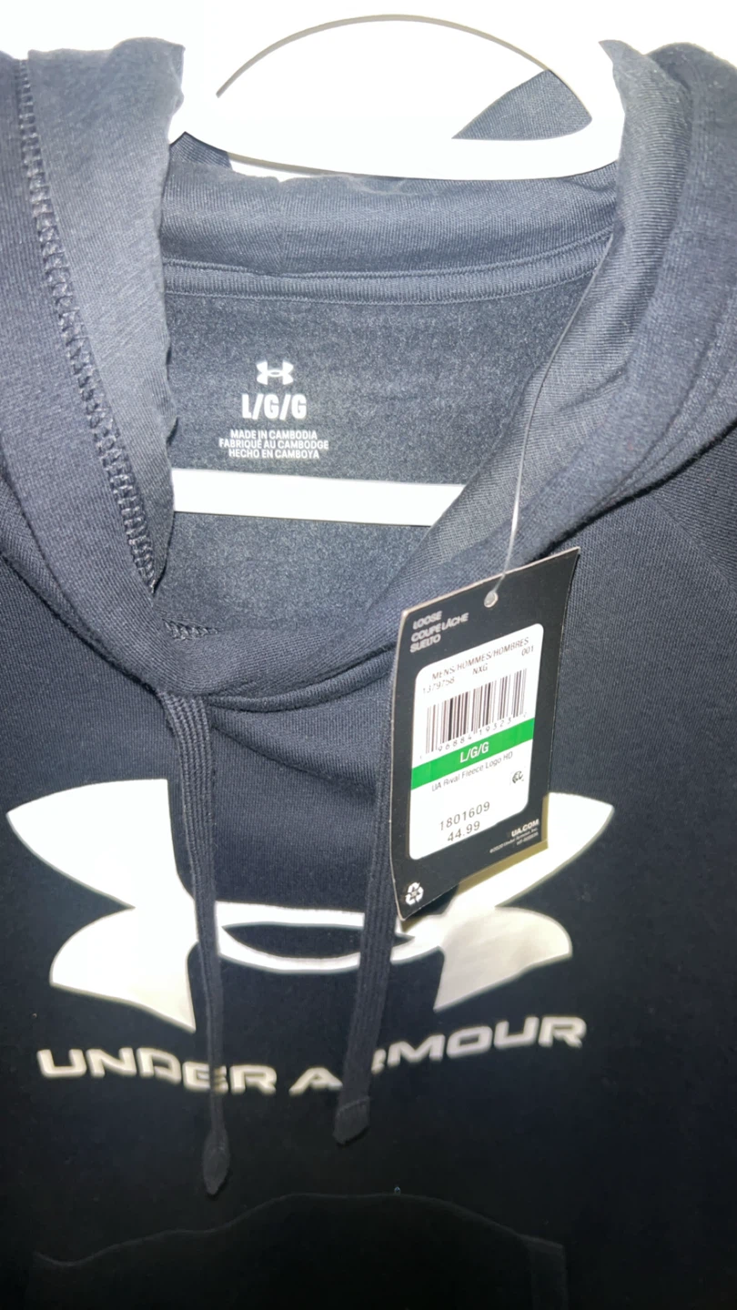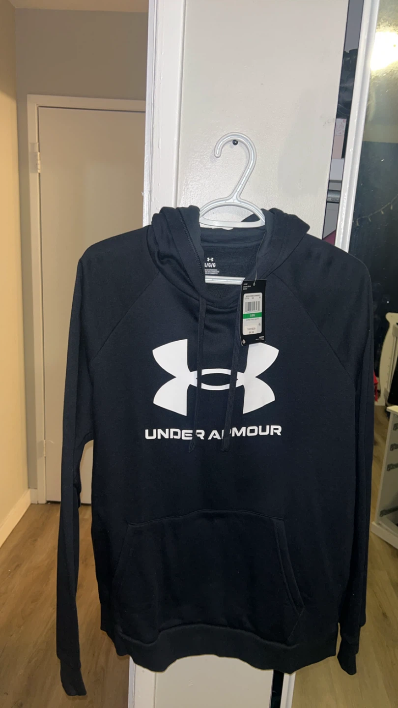 This is a black Under Armour Rival Fleece Logo Hoodie in size L/G. It's made with a loose fit and features the signature Under Armour logo on the front. Perfect for casual wear or athletic activities!