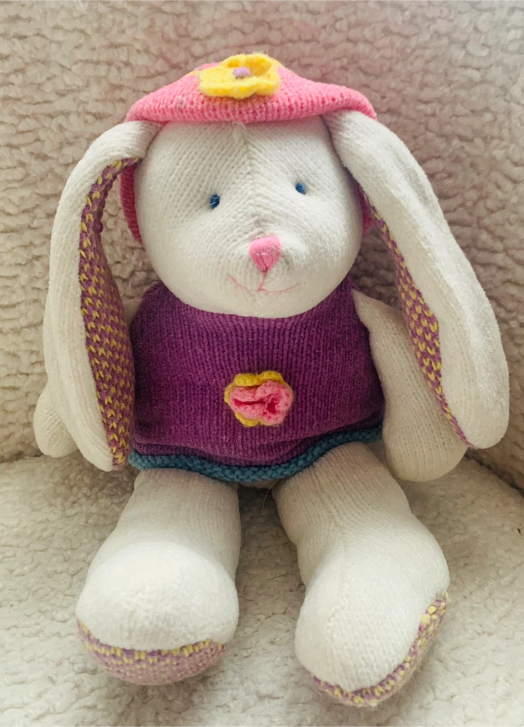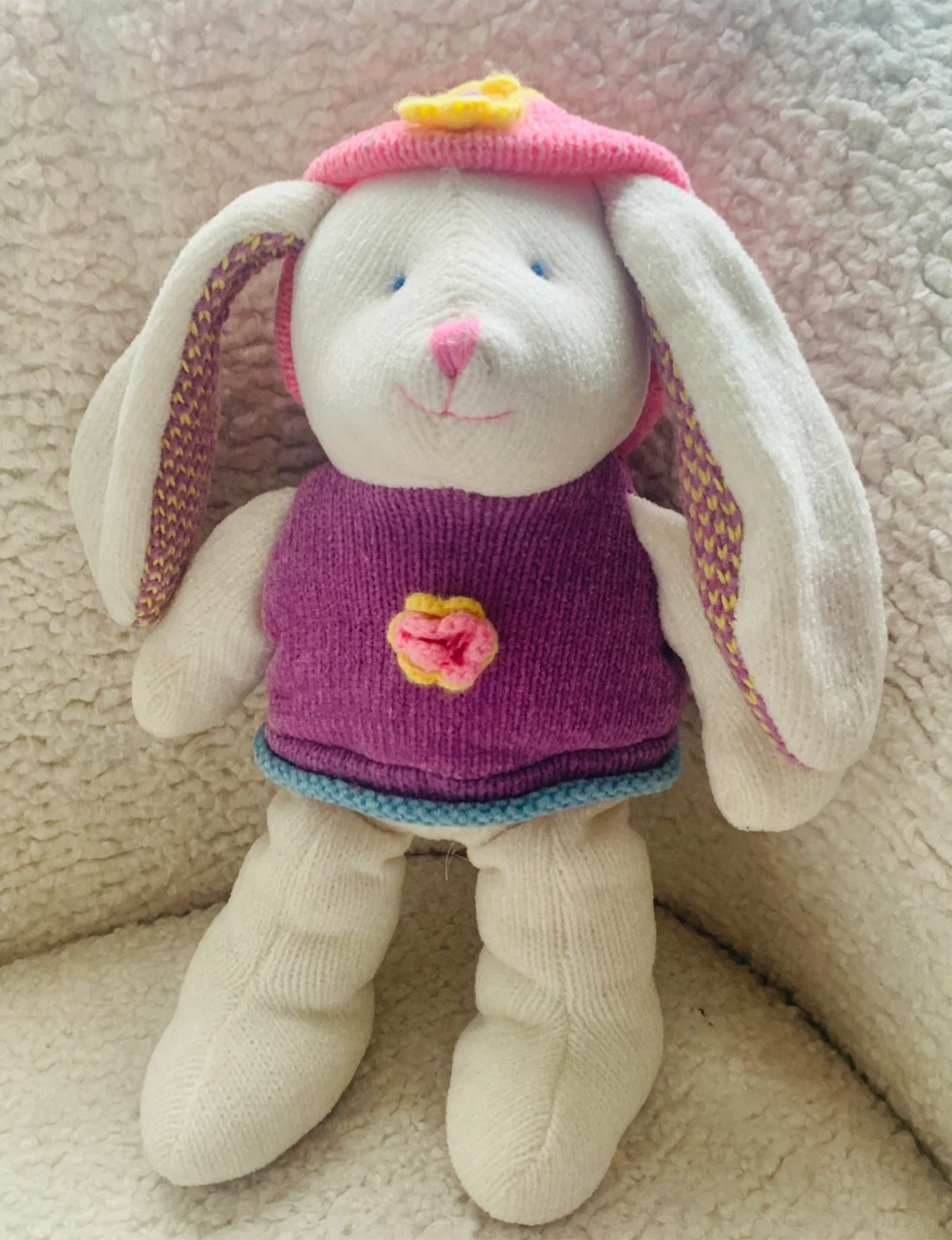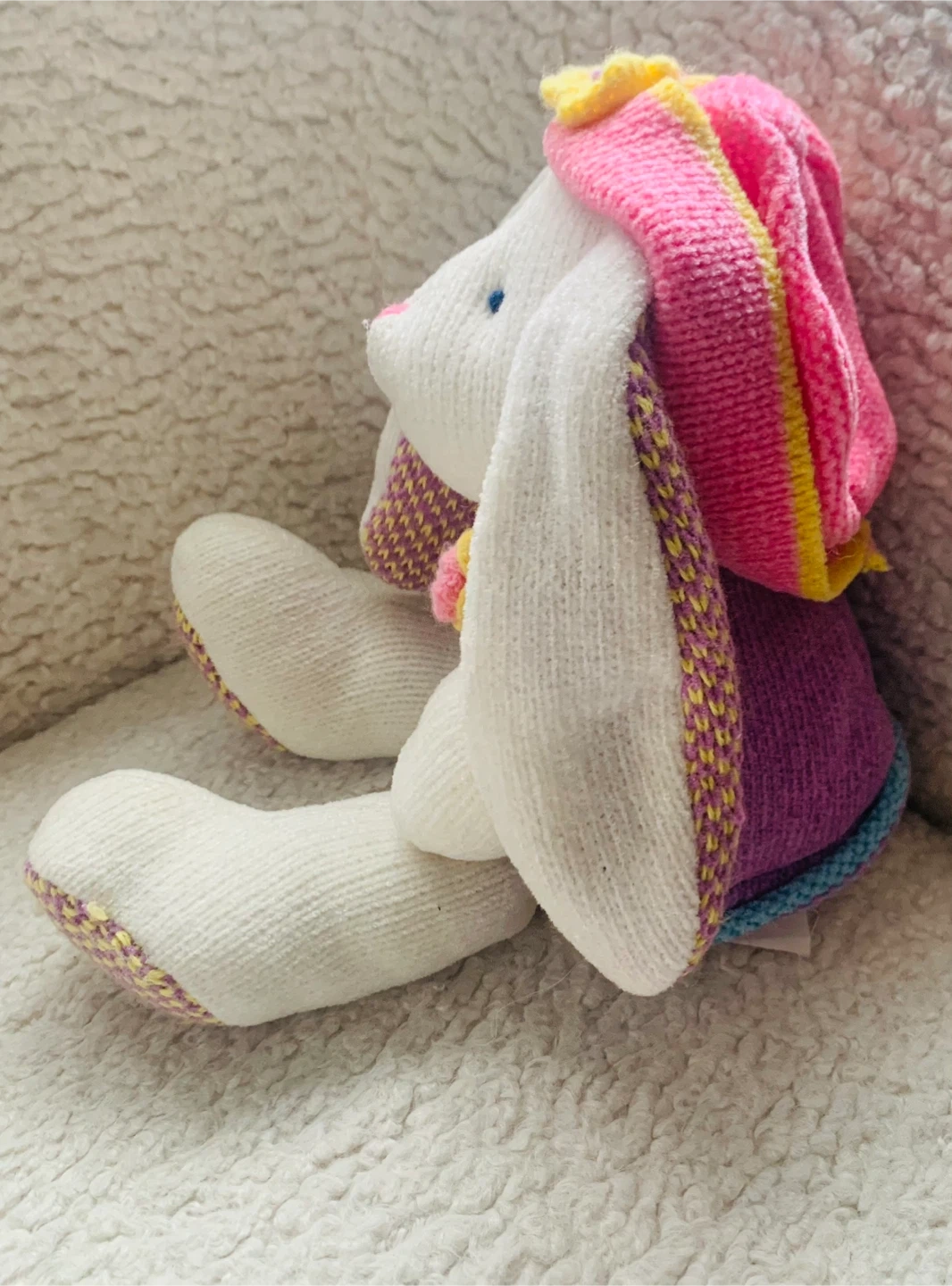 Adorably sweet Boodles stuffed bunny toy wearing a pink hat and purple sweater. It's made of polyester fibers. Surface washable for easy care.