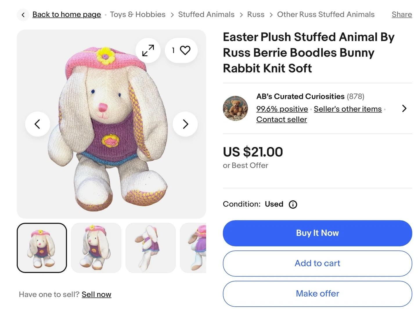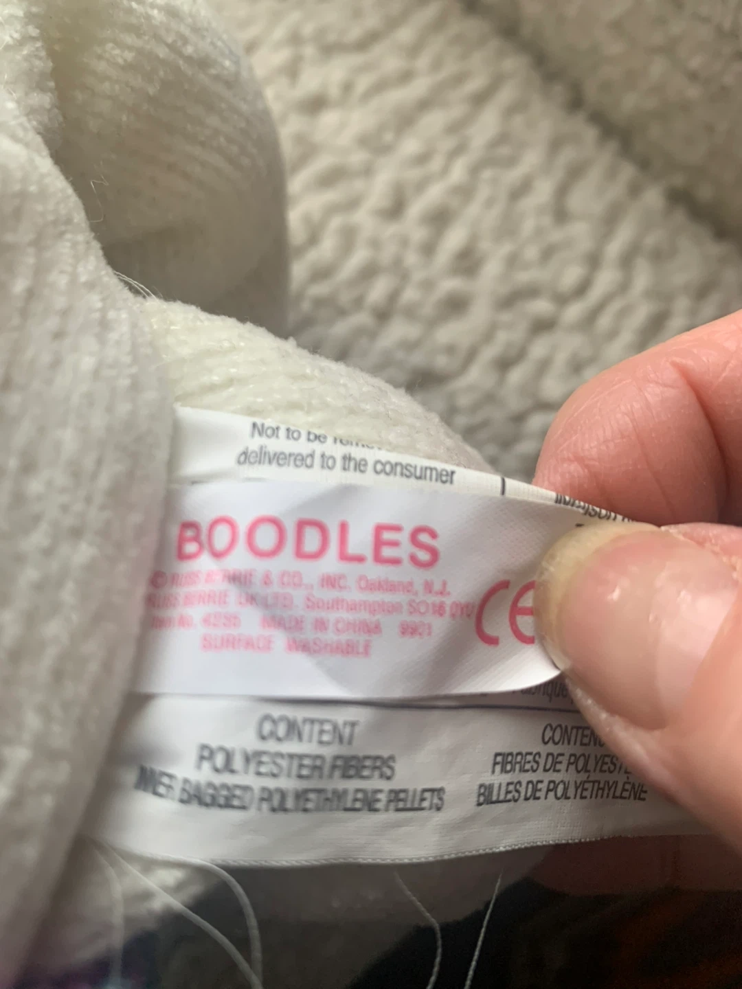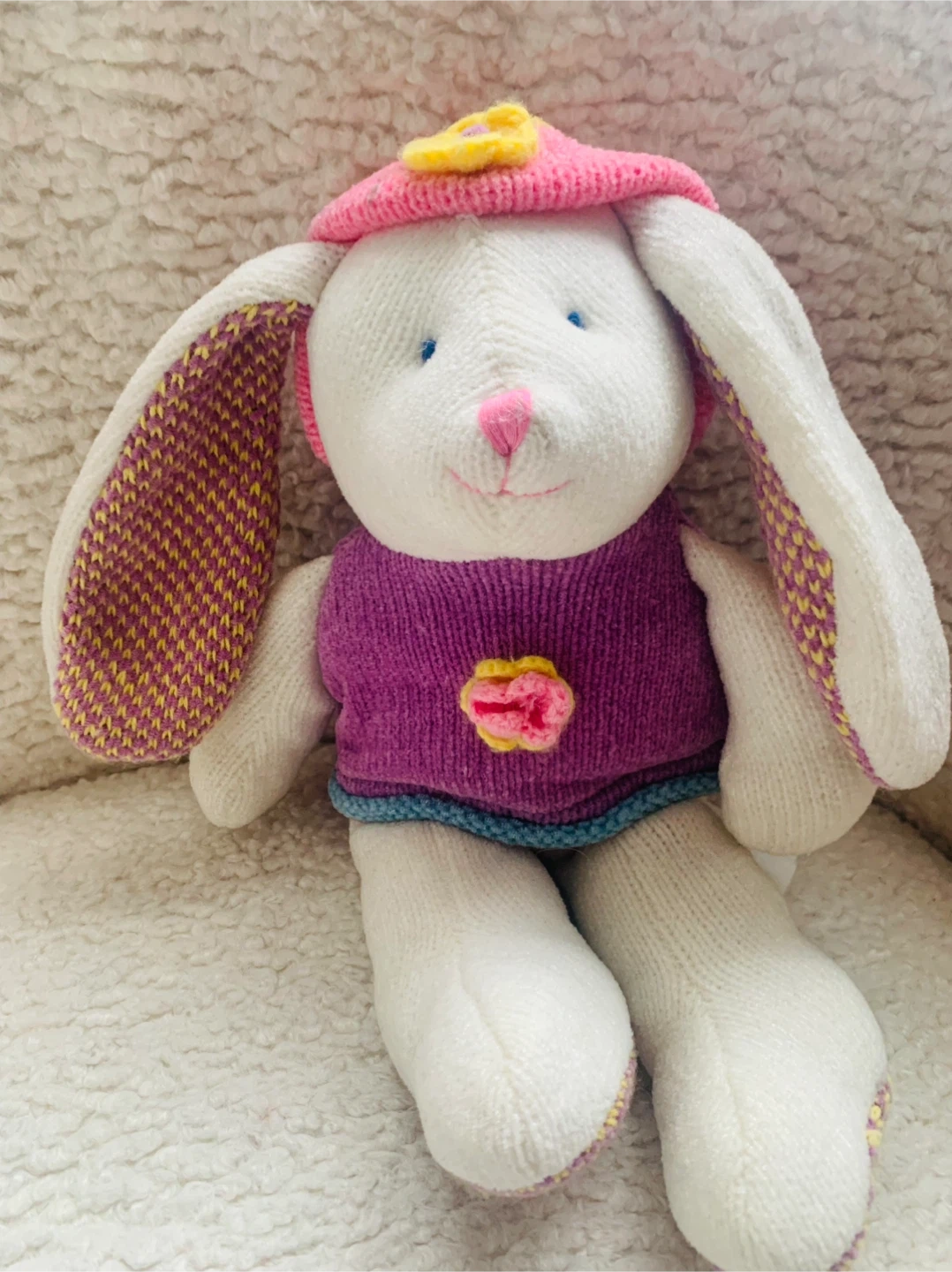 Adorably sweet Boodles stuffed bunny toy wearing a pink hat and purple sweater. It's made of polyester fibers. Surface washable for easy care.