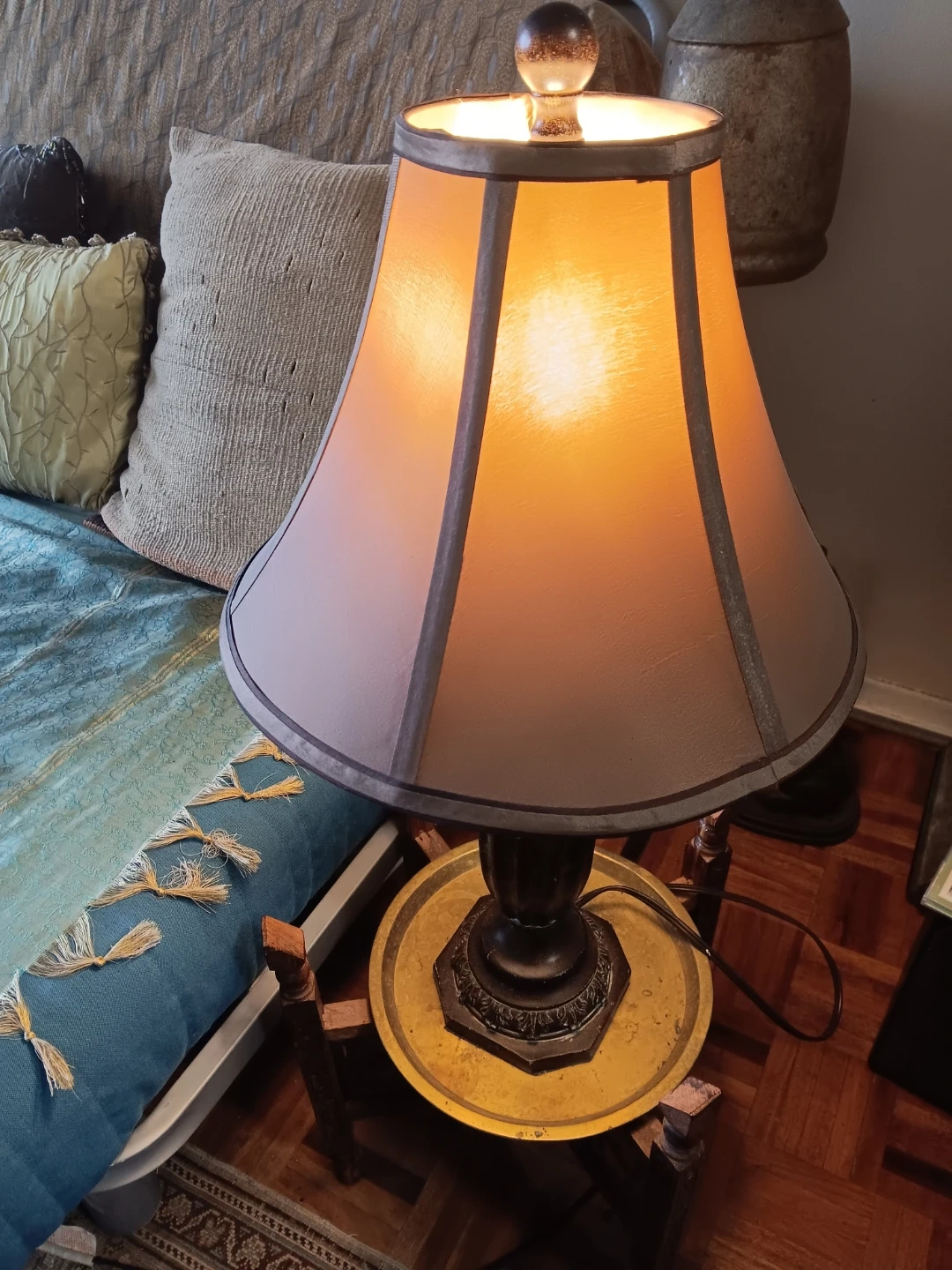 Selling a charming table lamp with a classic shade. It's in great condition and would look lovely in any room. The lamp has a decorative base and comes with a lampshade.